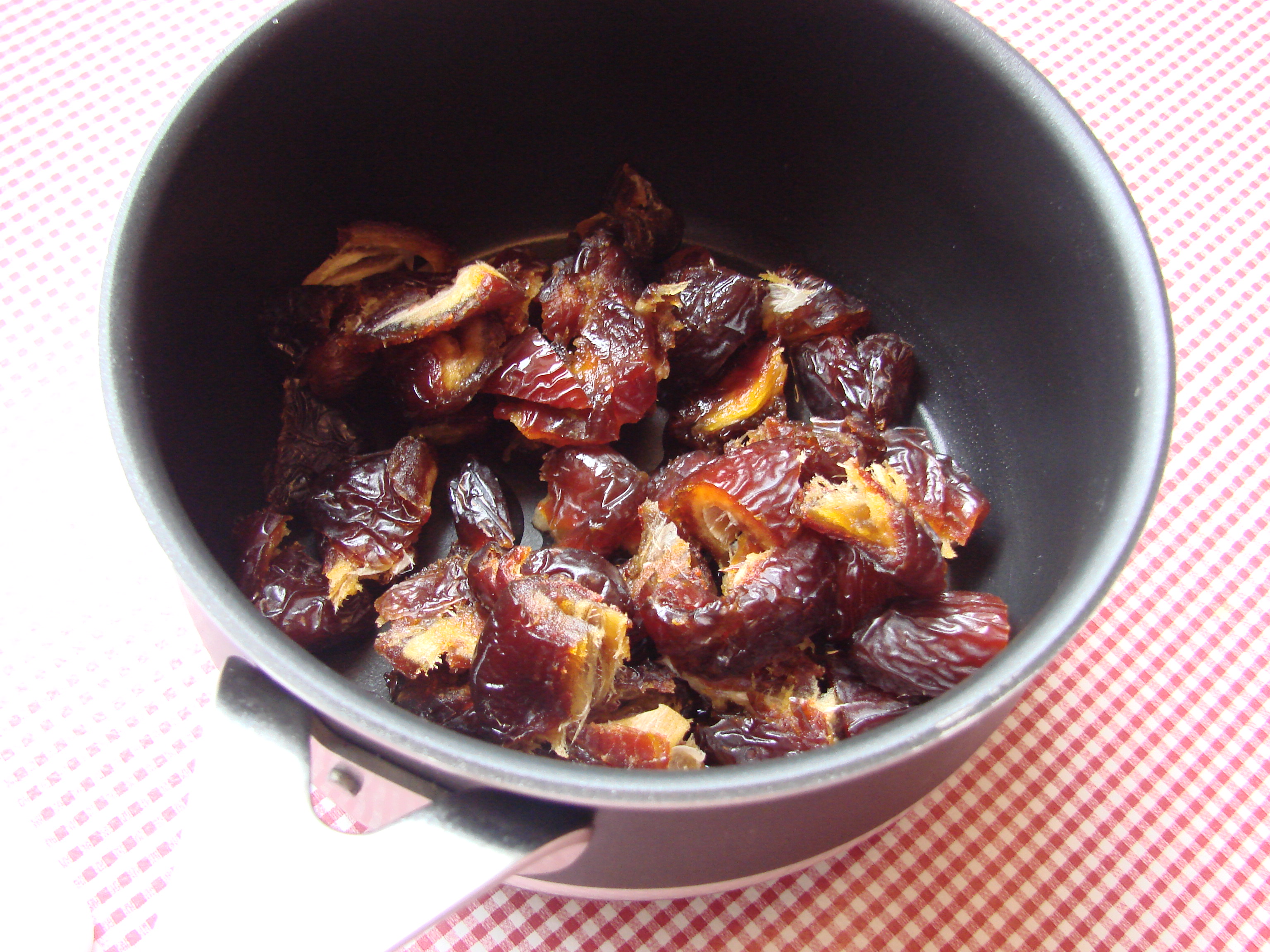 Setjið döðlur í pott og látia smá vatn fljóta yfir.