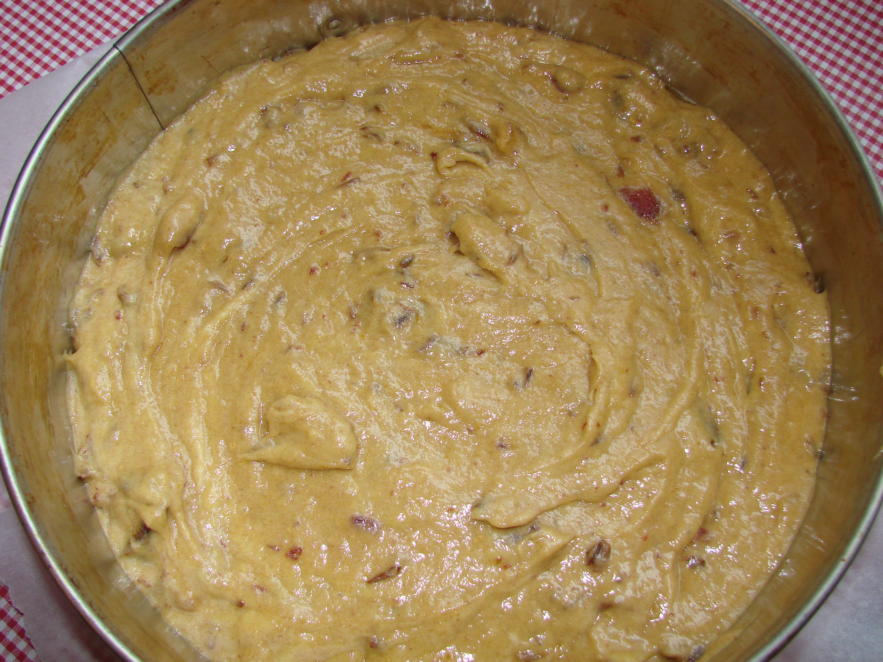 Deigið sett í lausbotna springformi, smyrja formið vel eða nota smjörpappír í botninn