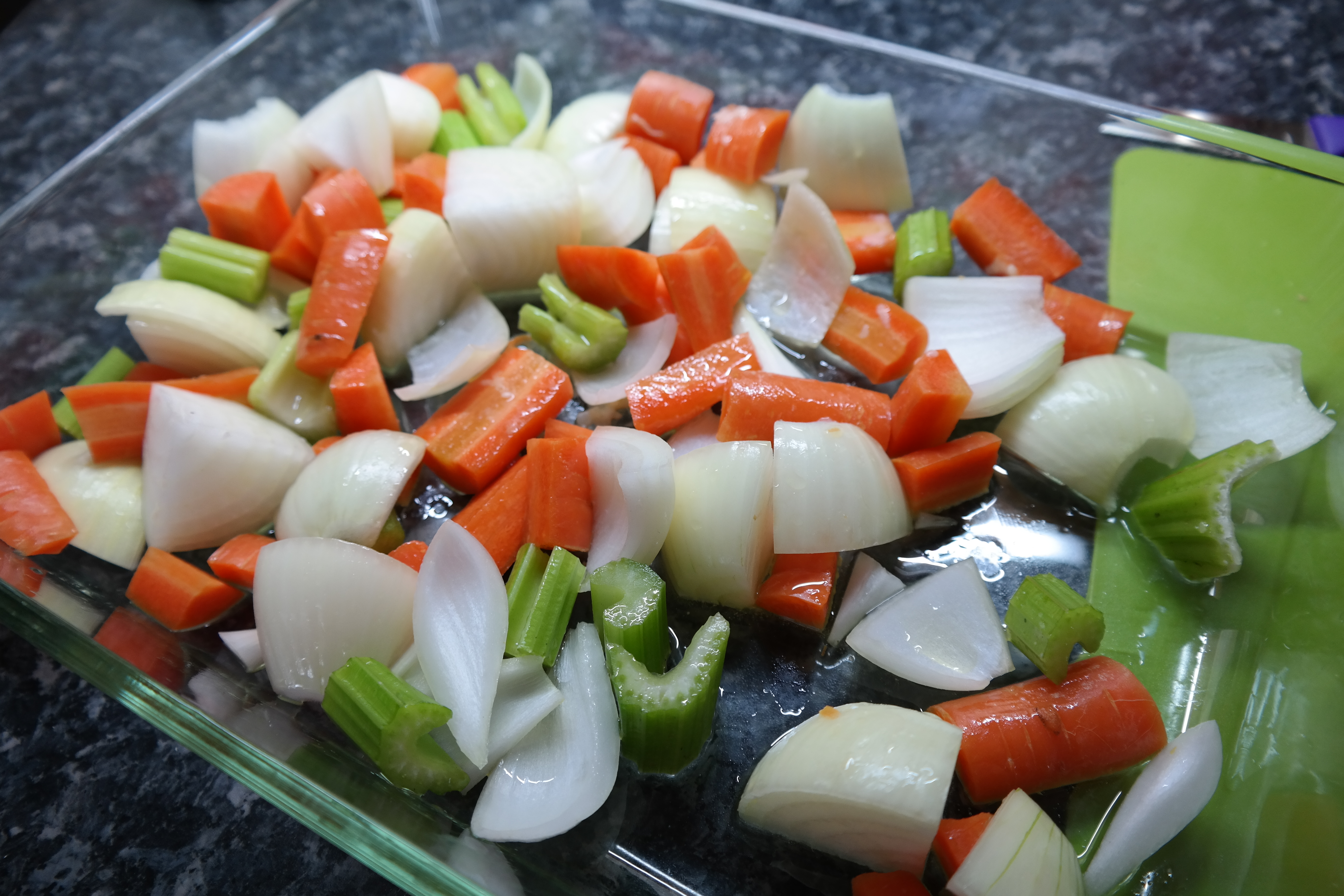 Það er óþarfi að skera utan af grænmetinu, nóg að skola það og skera í grófa bita. Hvítlauknum er skipt niður í heila geira. (Ég notaði reyndar hvítlauks mauk úr túpu og hrærði saman við grænmetið) Grænmetinu komið fyrir í eldföstumóti eða í steikarpott og olíunni dreift yfir.
