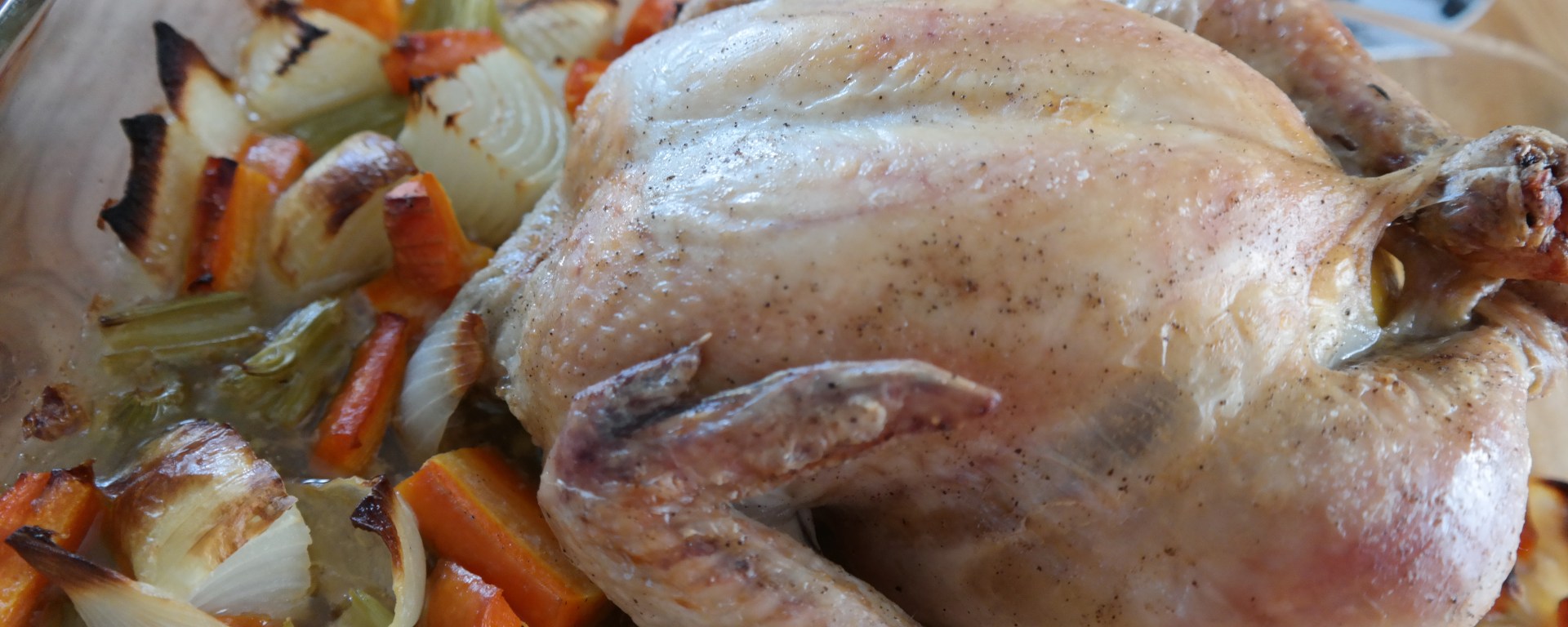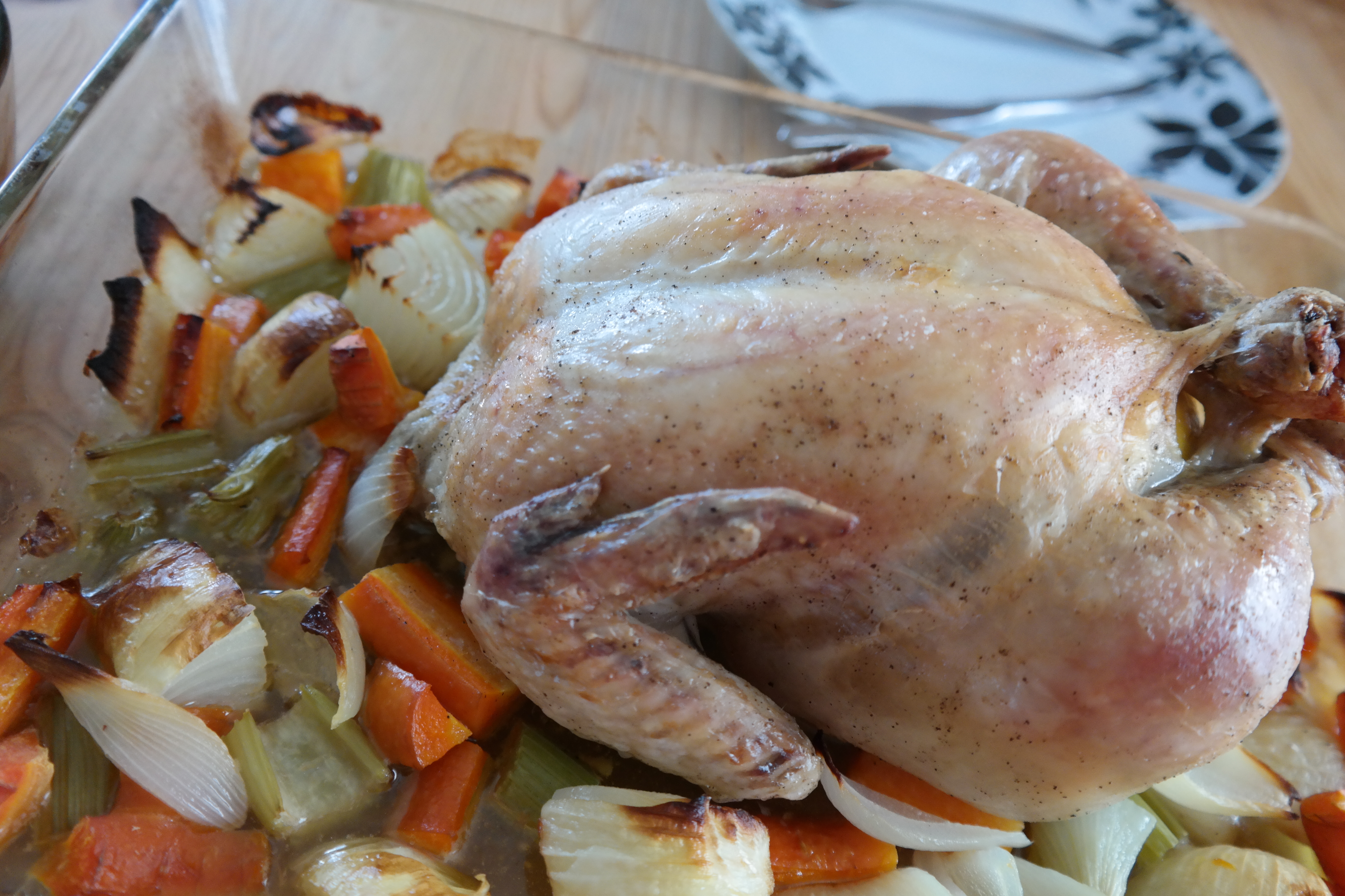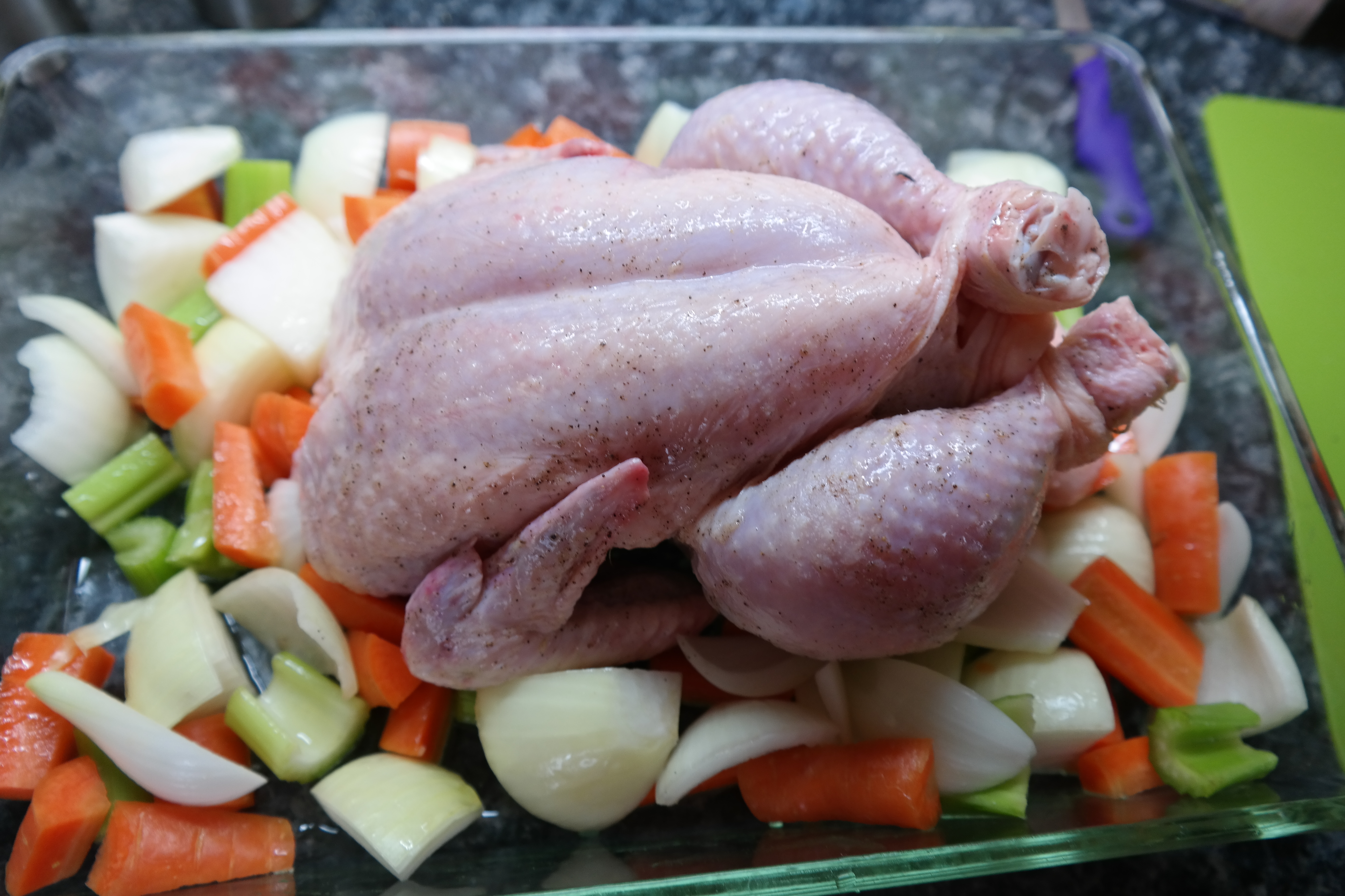 Kjúklingurinn er því næst settur í eldfastamótið/steikarpottinn ofan á grænmetið.