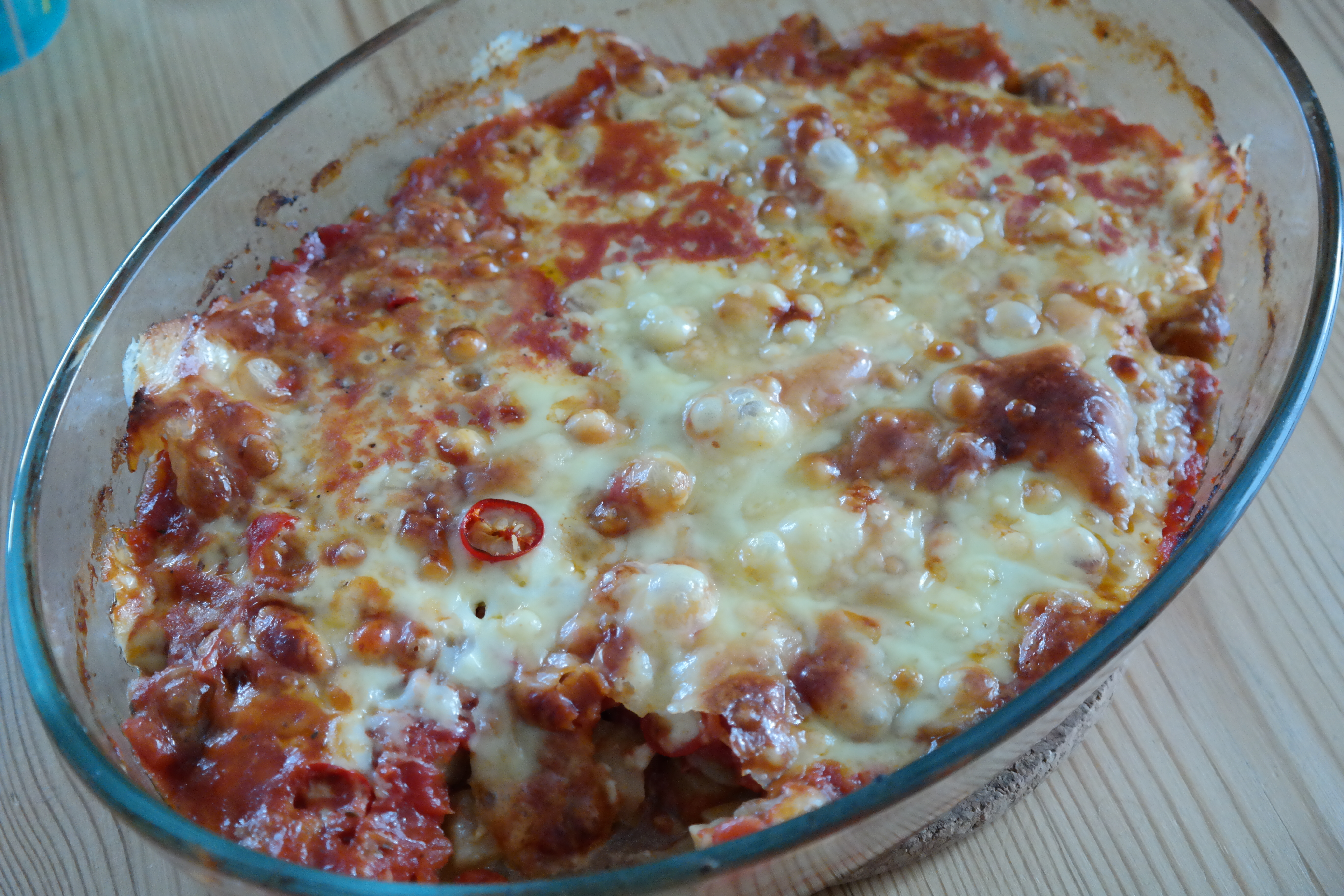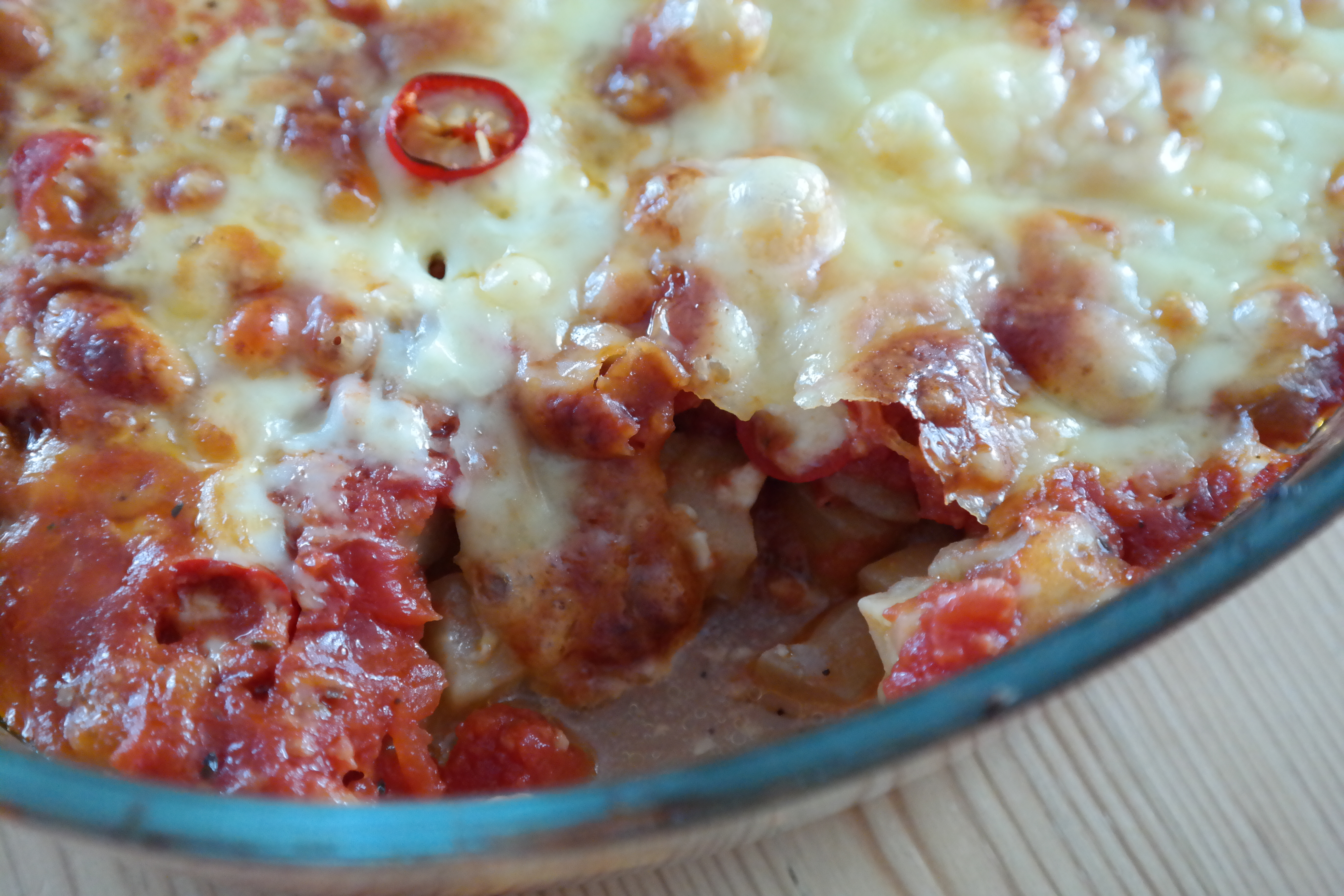 eggaldin teningarnir eru steikt á pönnunni og saltaðir til. Þá er teningunum blandað saman við hökkuðu tómatana og niðurskorið chilli (ef vill) og sett í eldfast mót. Rifnum osti stráð yfir og bakað í ofni við 200°c í ca. 40 mínútur.
