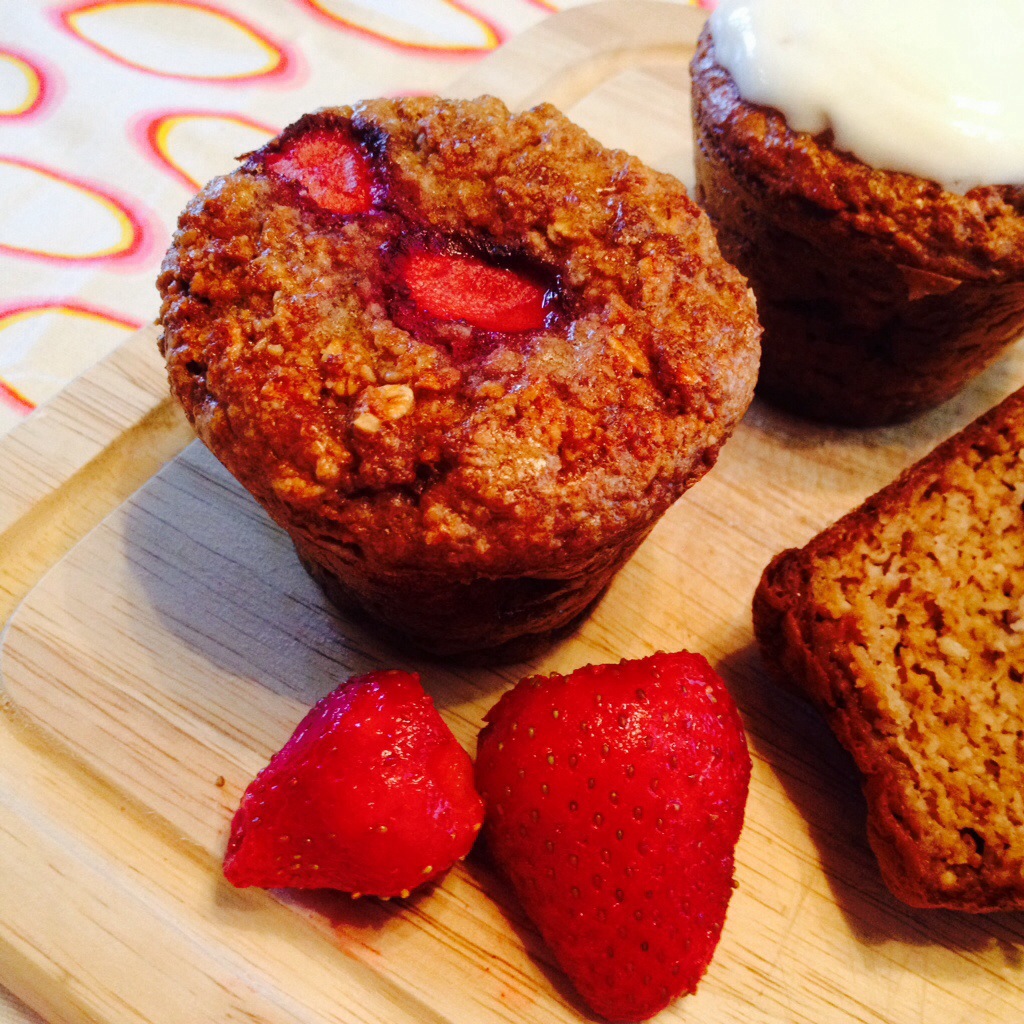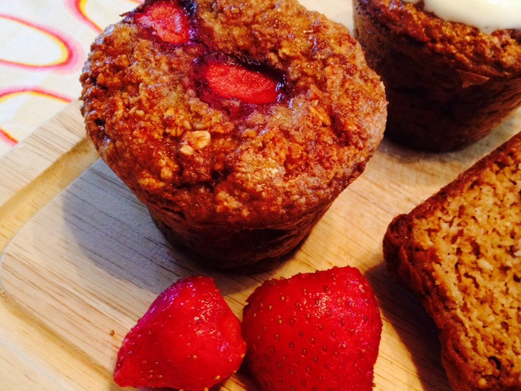 Hræra öllu vel saman, jarðarberin eru skorin í bita. Nota ca 2 tsk hunang. Degið sett í pappírs muffinform eða í sílíkon muffin form (notaði stórt sílíkon muffin form fyrir 6 múffur. Tvö, þrjú jarðarber skorin í sneiðar og sett ofan á hverja múffu, ásamt smá hunangi.