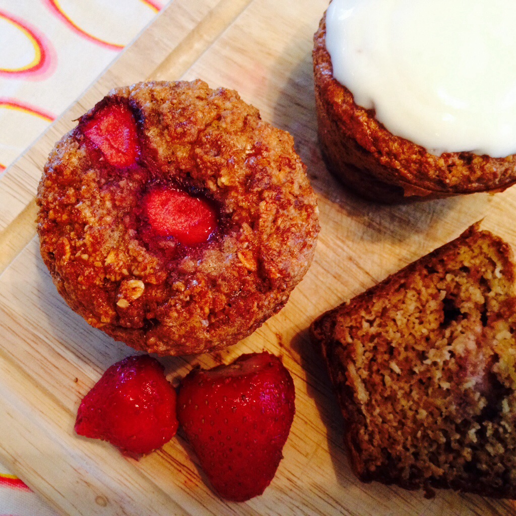 Dóttir mín sem er fimm ára elskar hafragraut og eftir að hafa smakkað bita af múffunni bað hún mig að skera eina múffu í ,,í marga bita“ og setja jógúrt, jarðarber og jarðarberja sultu ofan á. Áttum því miður ekki sultu svo jarðarber og reyndar bað hún um bananabita líka þegar hún var hálfnuð fékk að duga í þetta sinn 🙂