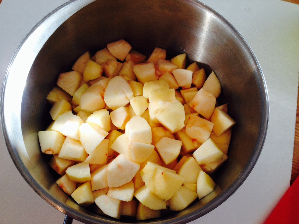 Eplin skræluð og kjarnahreinsuð. Skorin í grófa bita og sett í pott ásamt vatni og kanil. Ég notaði u.þ.b. 1 líter af vatni þar sem ég ætlaði að nýta umfram safann í uppskrift af sykurlausum afmælis bollakökum. Annars er 1/2 líter af vatni nóg.