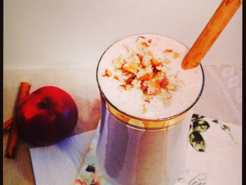 Drykkinum hellt í drykkjarglas og toppað með smá jógúrt, gróft hökkuðum pekanhnetum og smá fljótandi hunangi (ef vill)