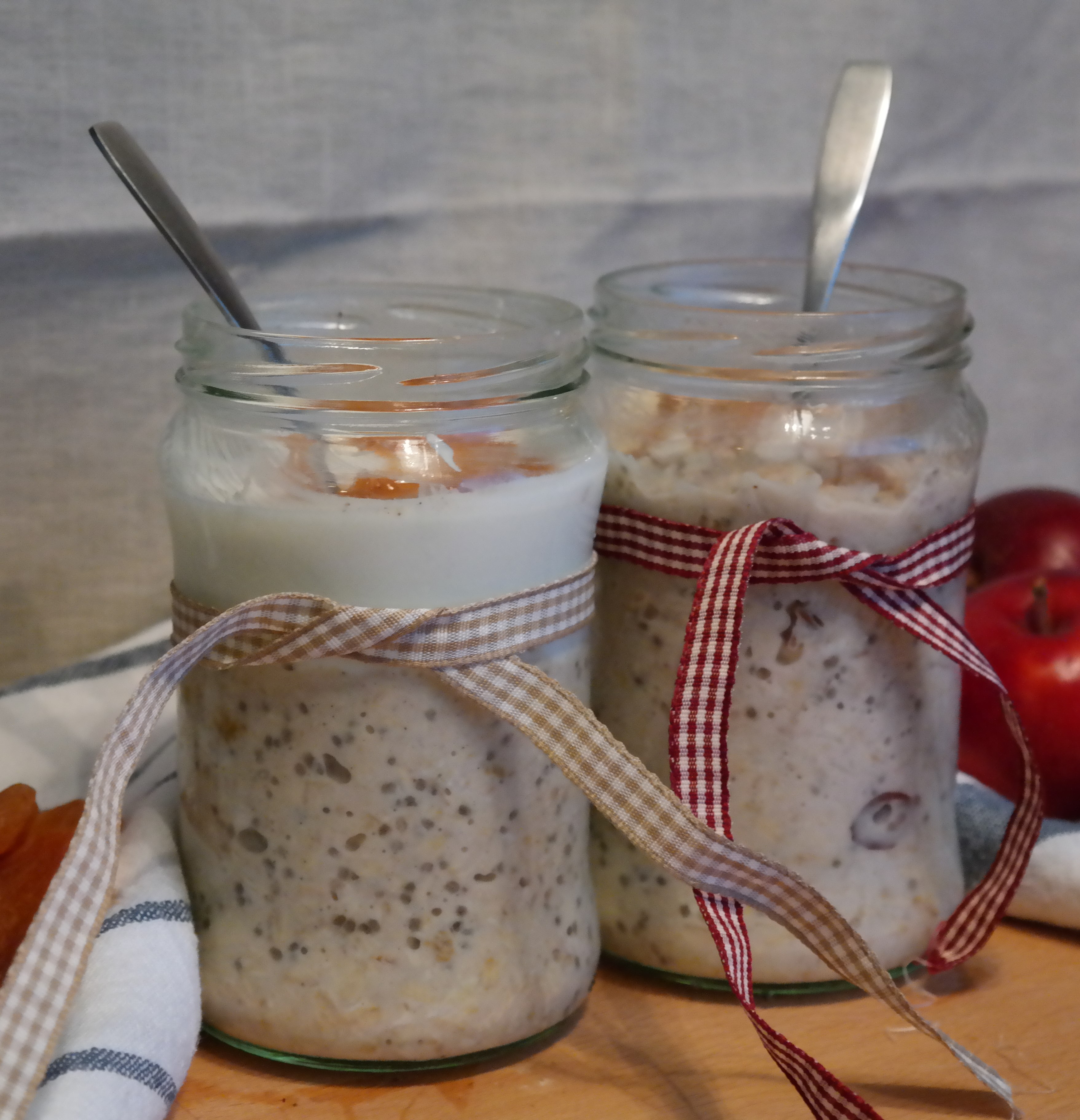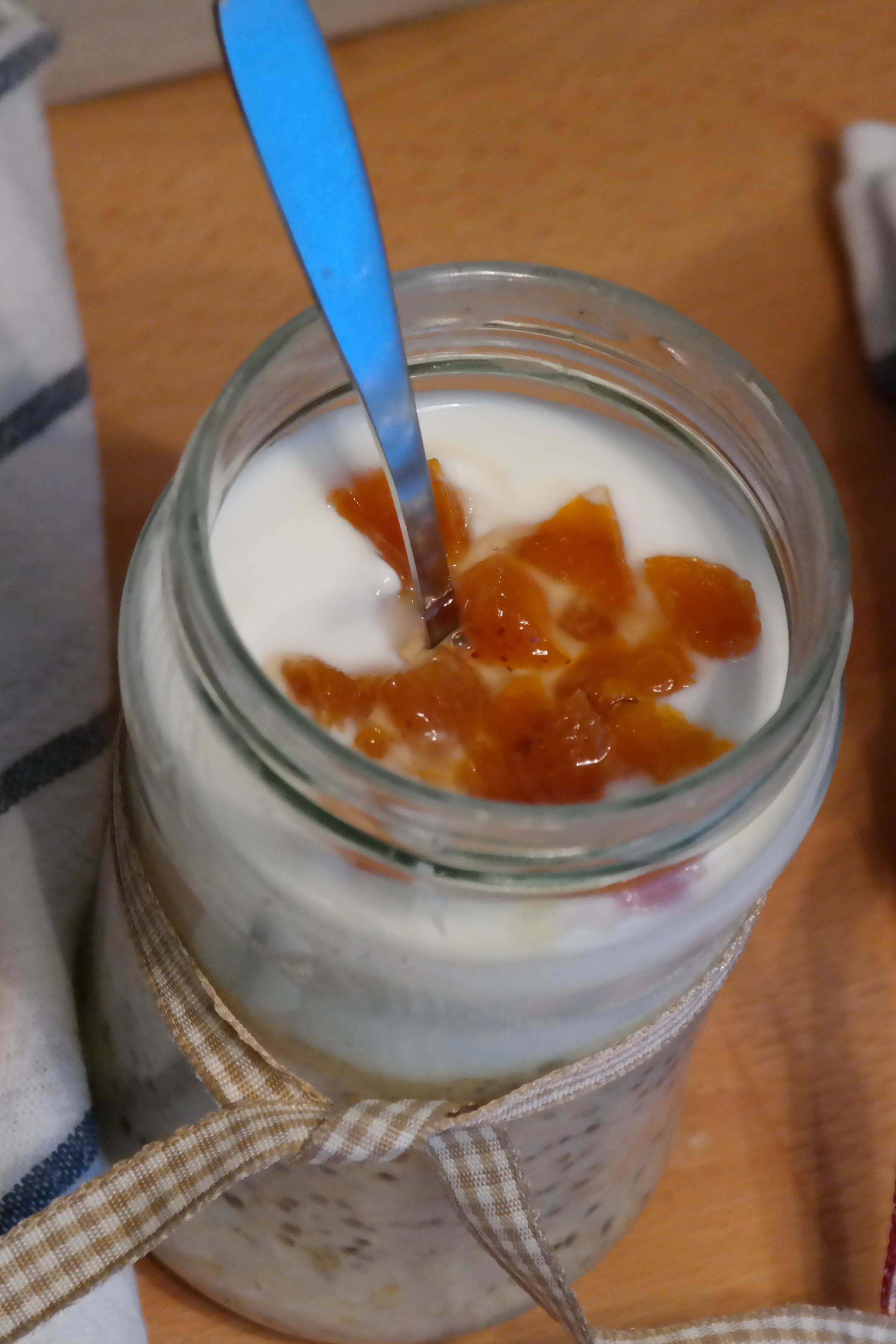 Skera apríkósurnar í litla bita og hræra vel saman við haframassann, lokið sett á og grauturinn settur inní ísskáp til næsta morguns.
