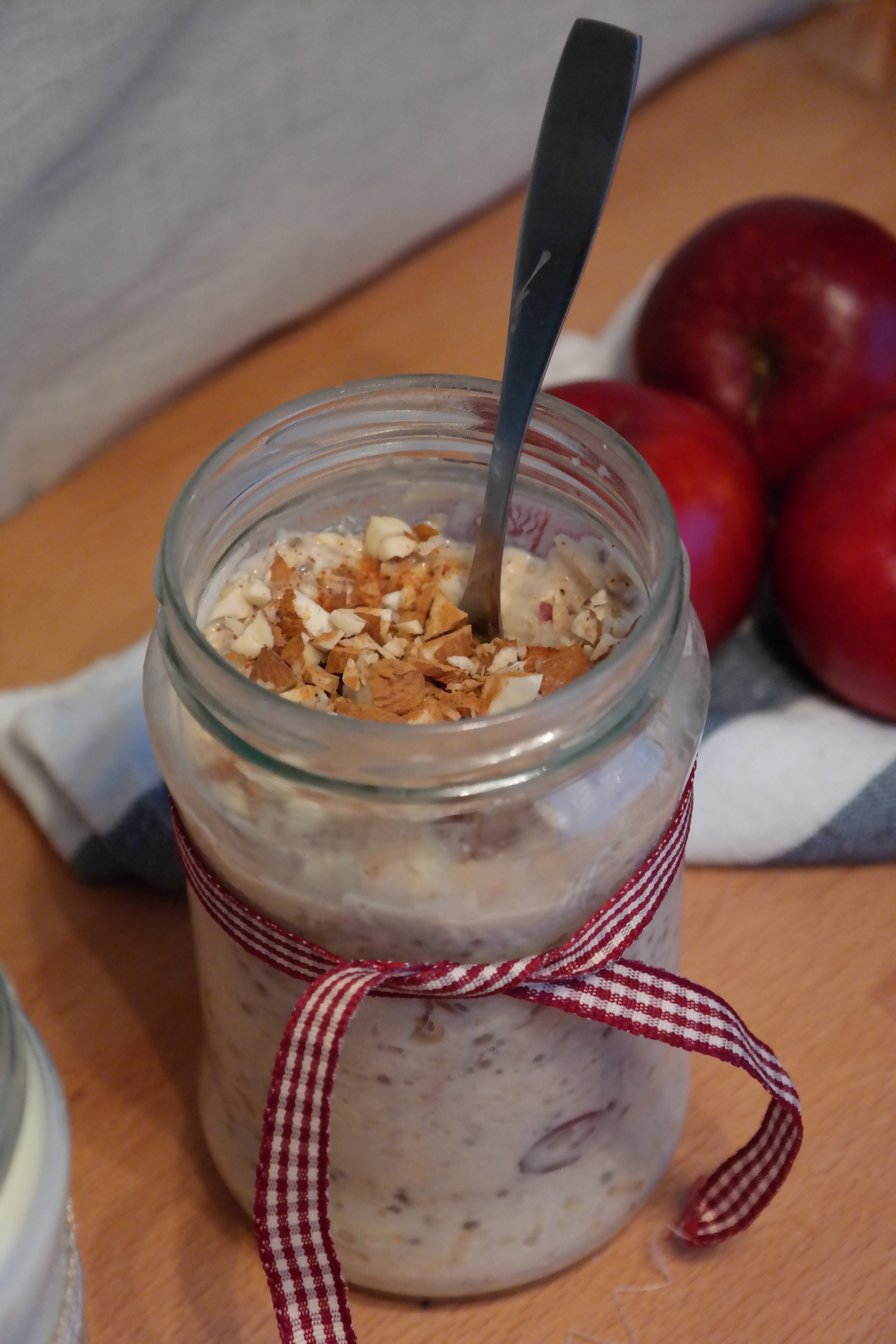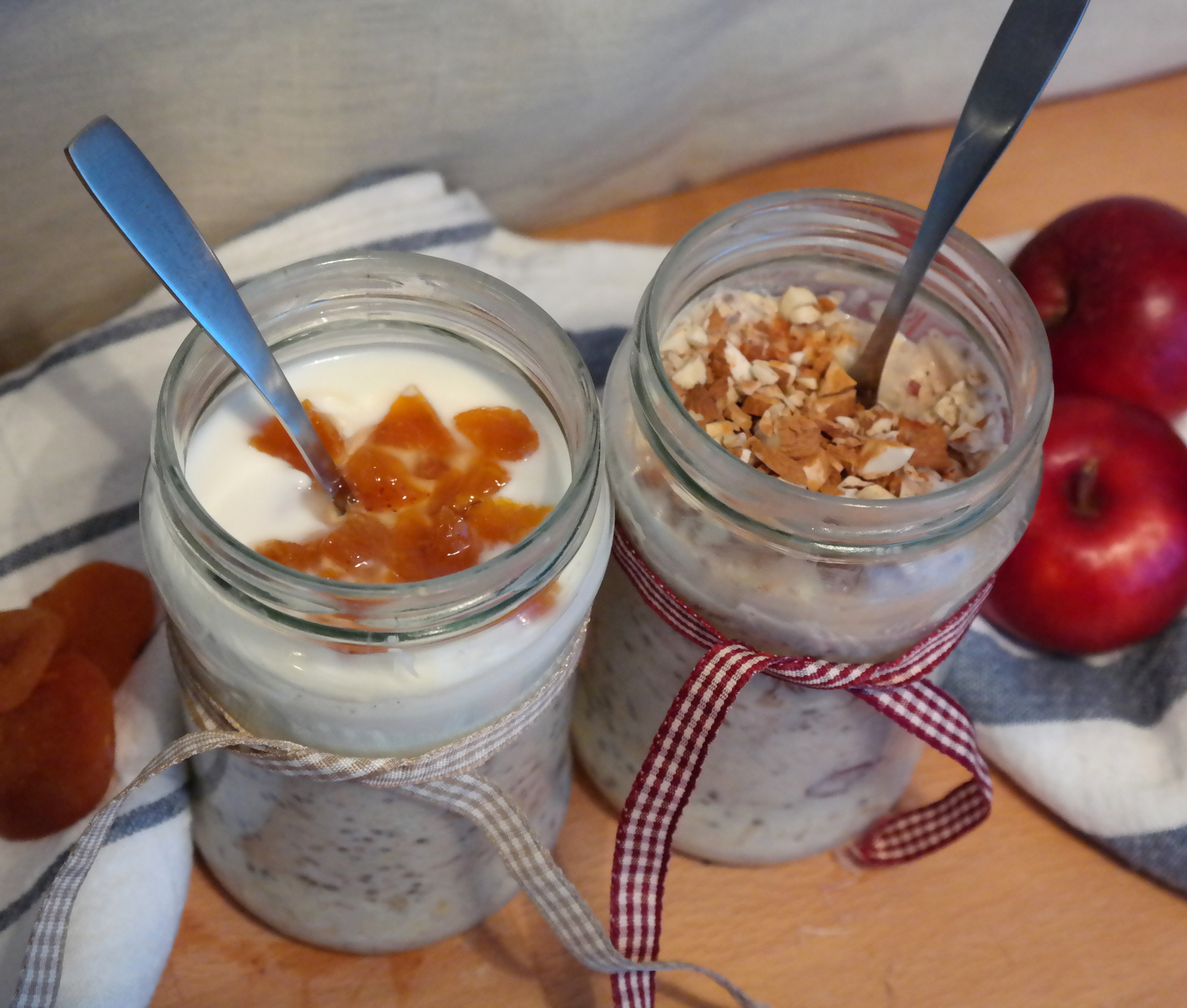 Haframjölið, chia fræin og mjólkin eru sett í krukku eða annað ílát (verður að vera með loki) og hrært vel saman.