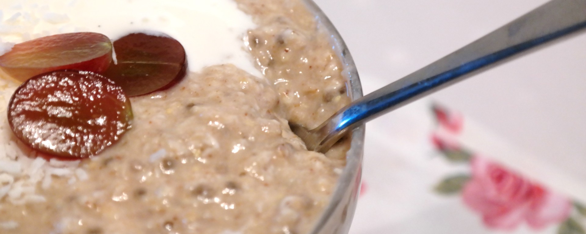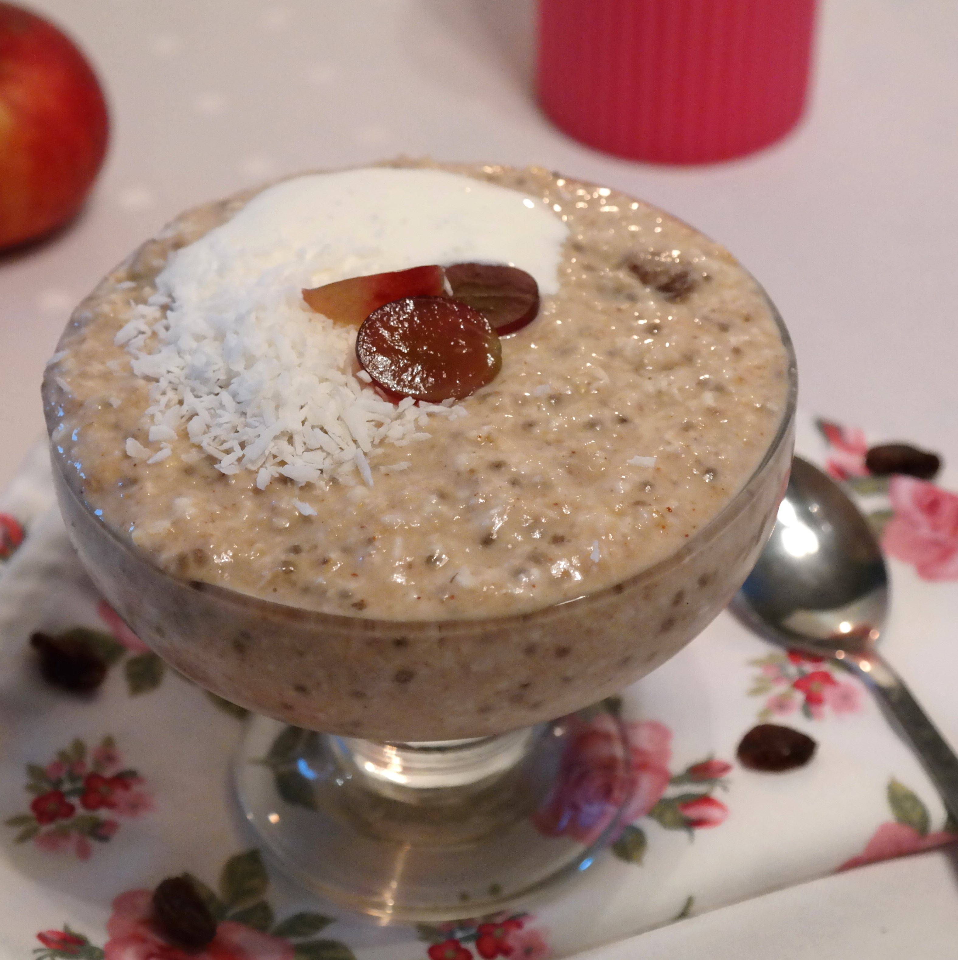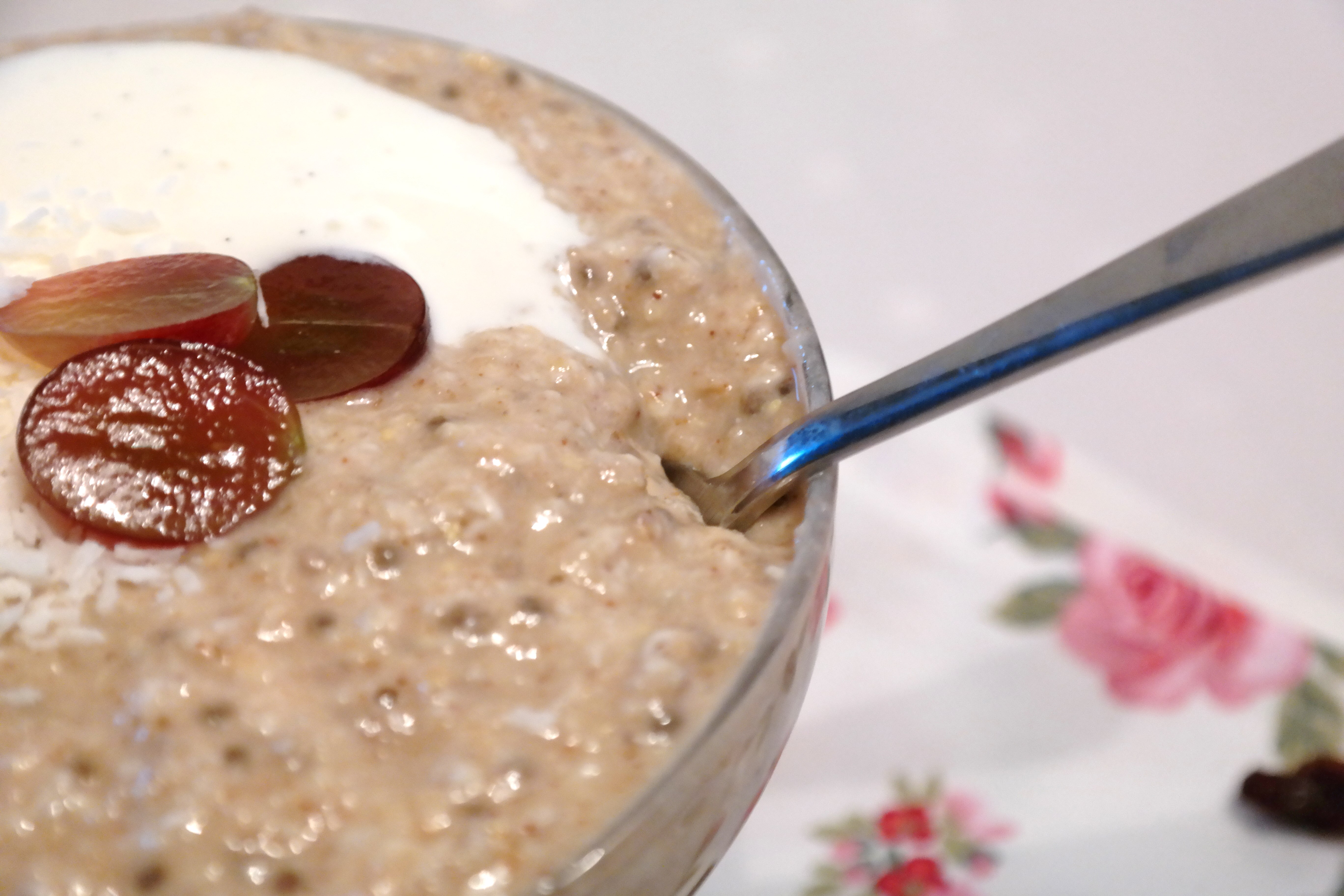 Toppað með grískri jógúrt, kókos, vínberjum og etv. smá kanil.