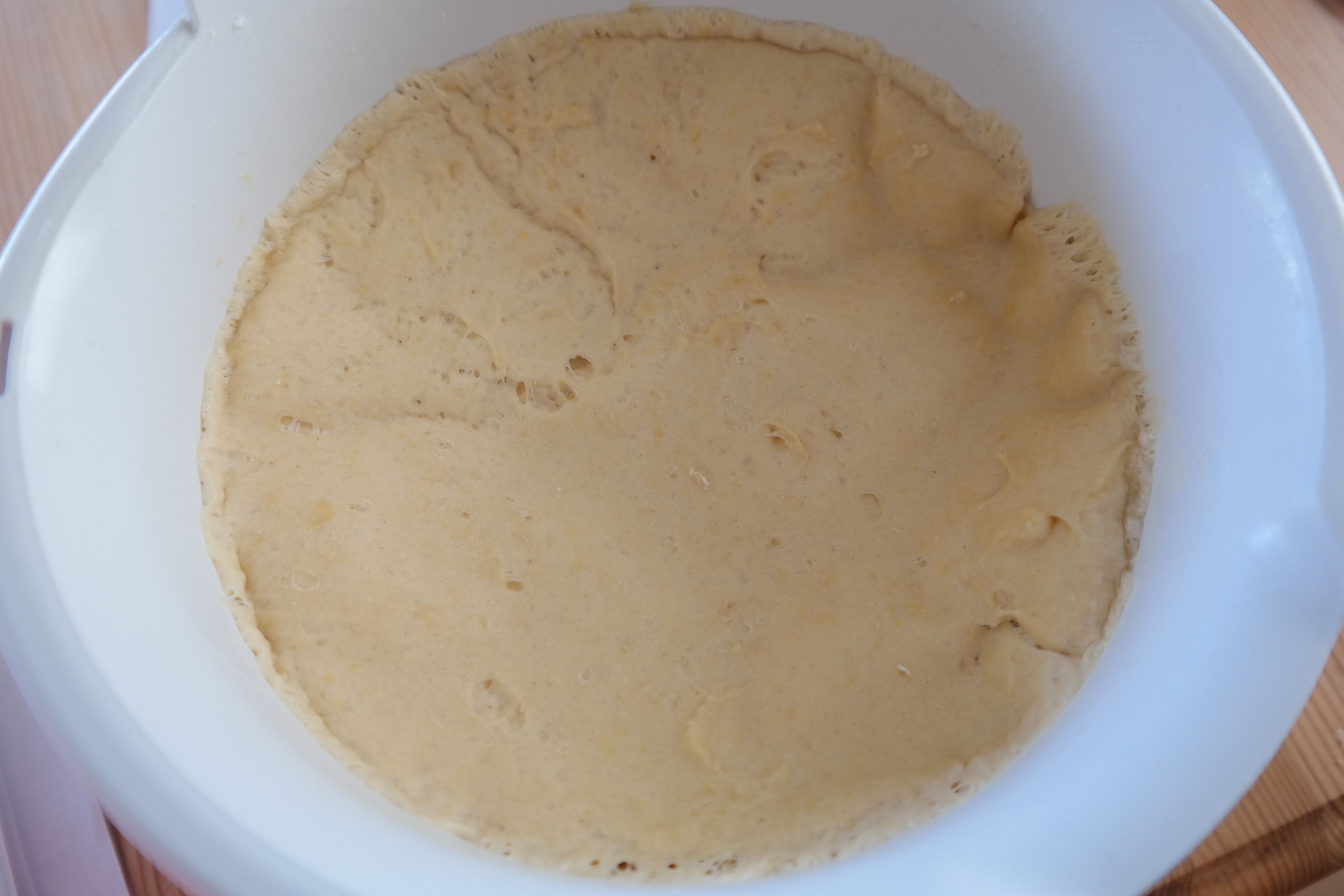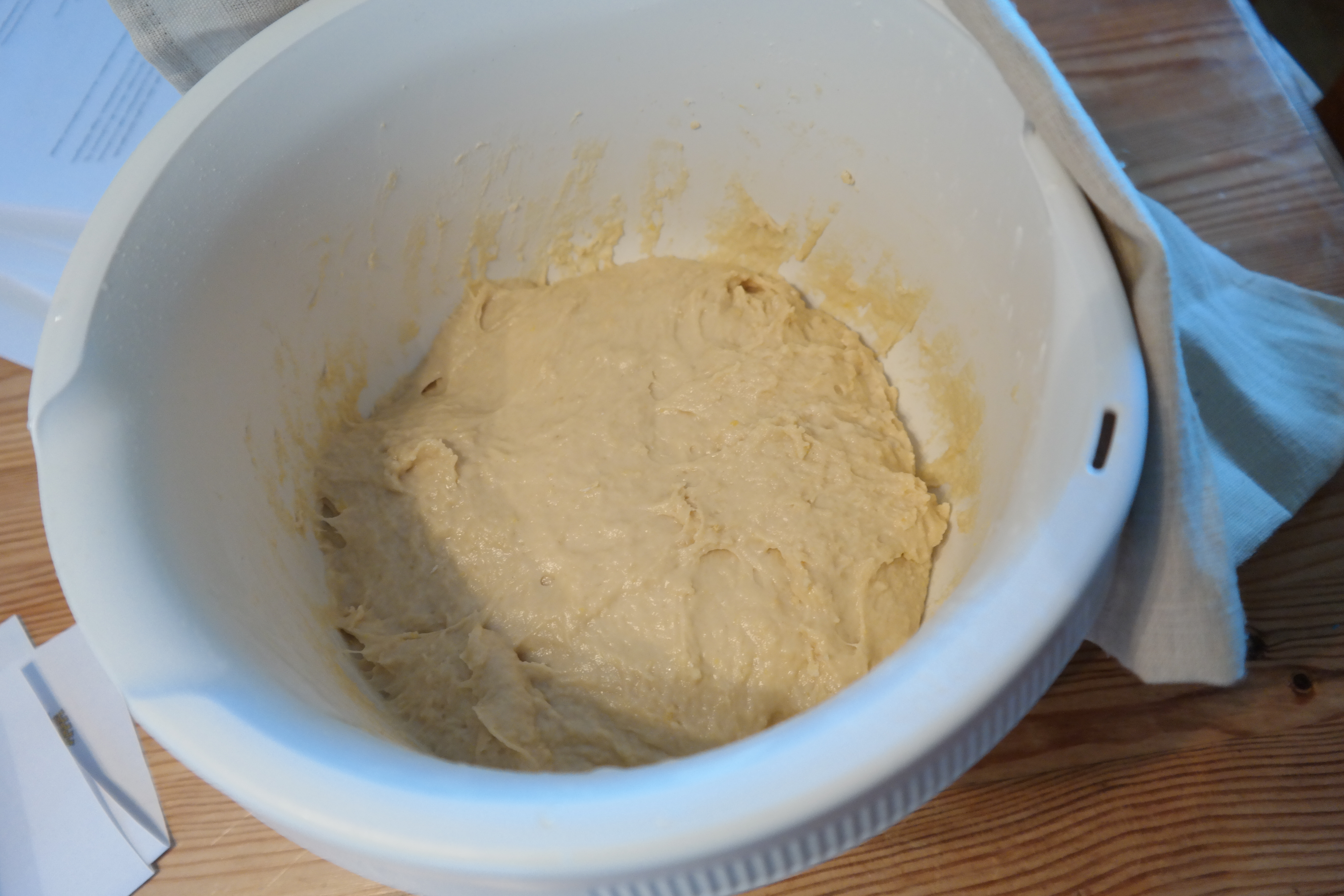 Blanda brædda smjörinu og vatninu saman ca. 41°c heitt. Smjörblöndunni er svo blandað saman við sykurinn, gerið og saltið og að lokum hveitinu, einn bolla í einu, hræra vel á milli. Hnoða vel í ca. 5 mínútur (gæti verið betra að hnoða á borðplötu en í hrærivélinni).