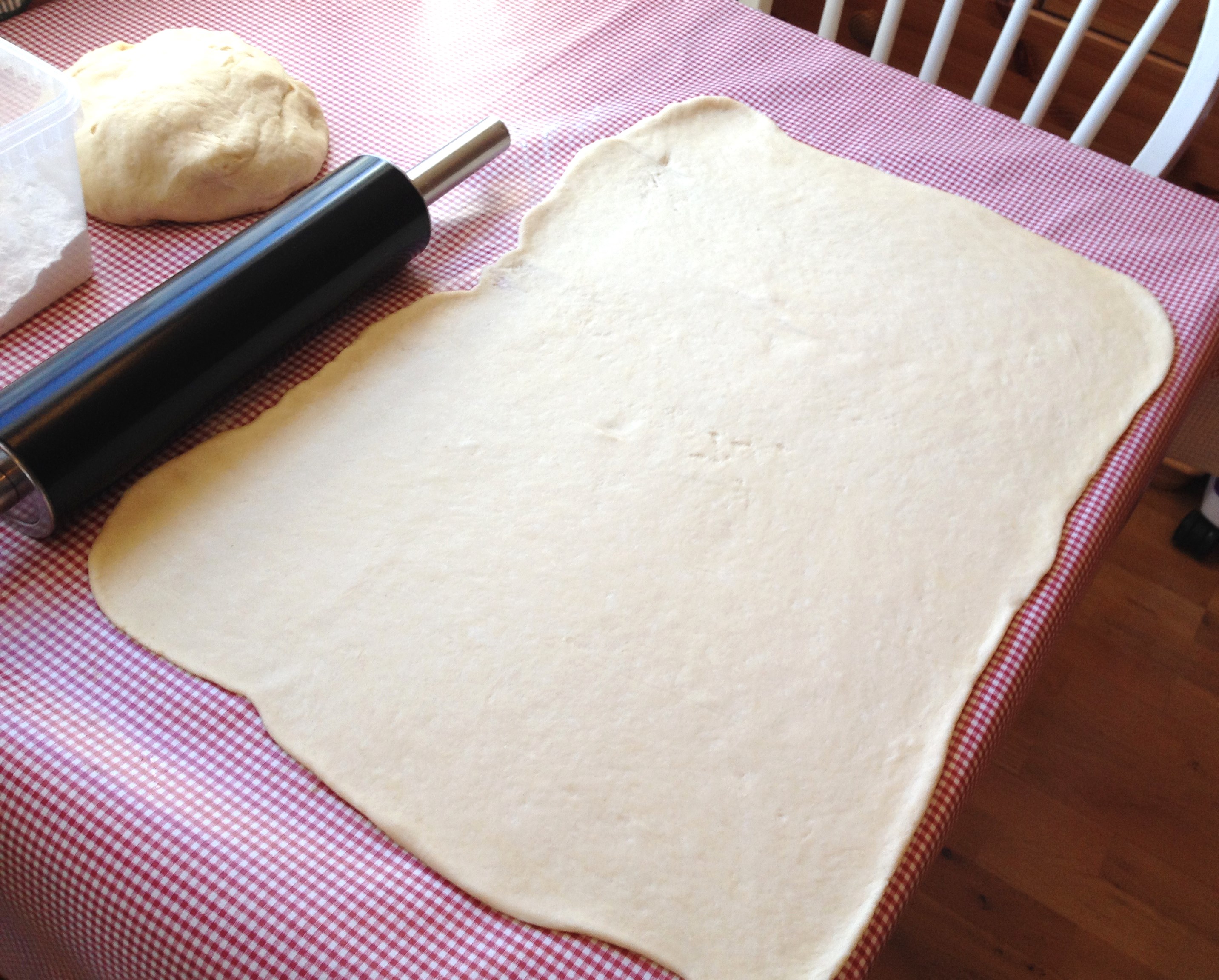 Deigið tekið úr skálinni og hnoðað aðeins á borðplötu, deiginu síðan skipt í tvennt. Fletja út deigið í ca. 20 x 30 cm.