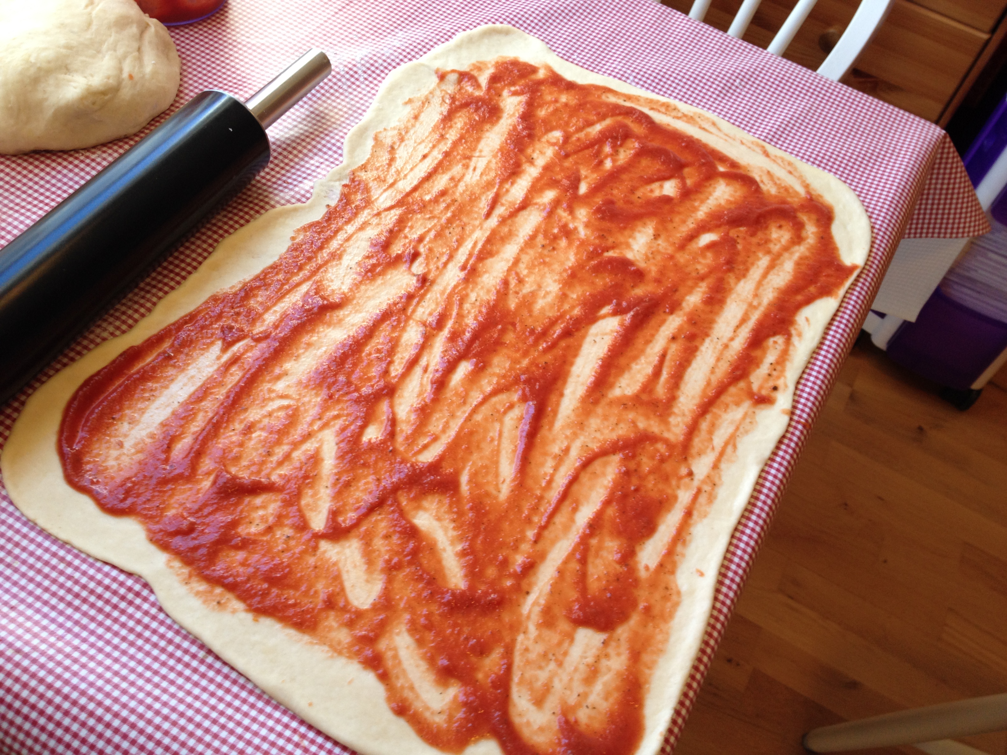 Smyrja þunnu lagi af pizza sósu yfir allan rétthyrininginn.
