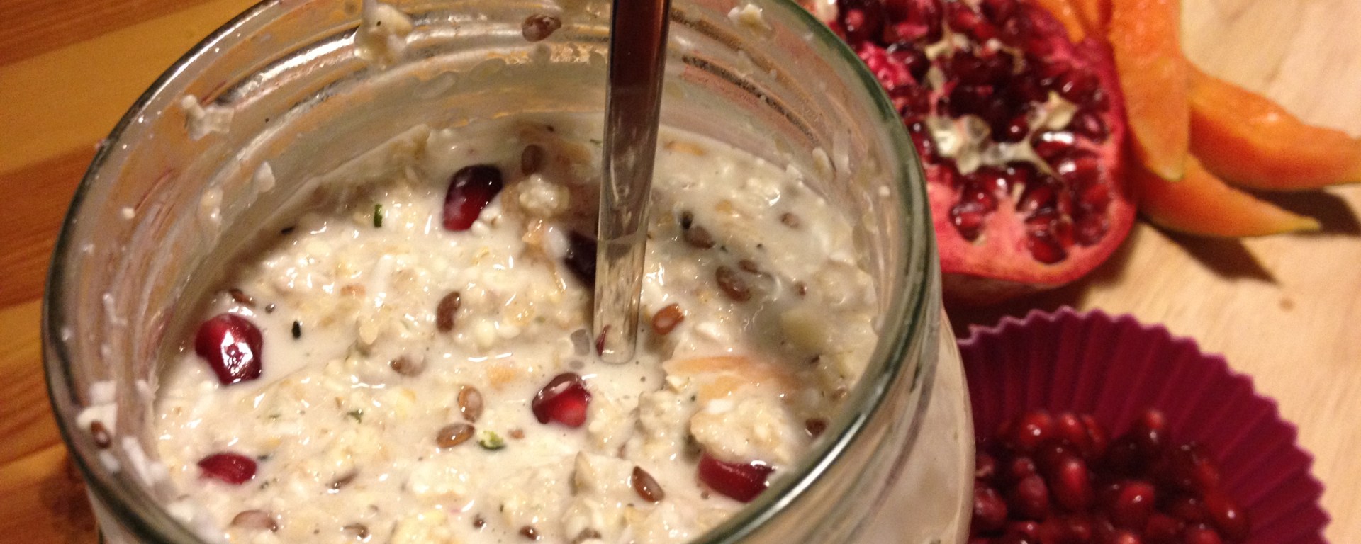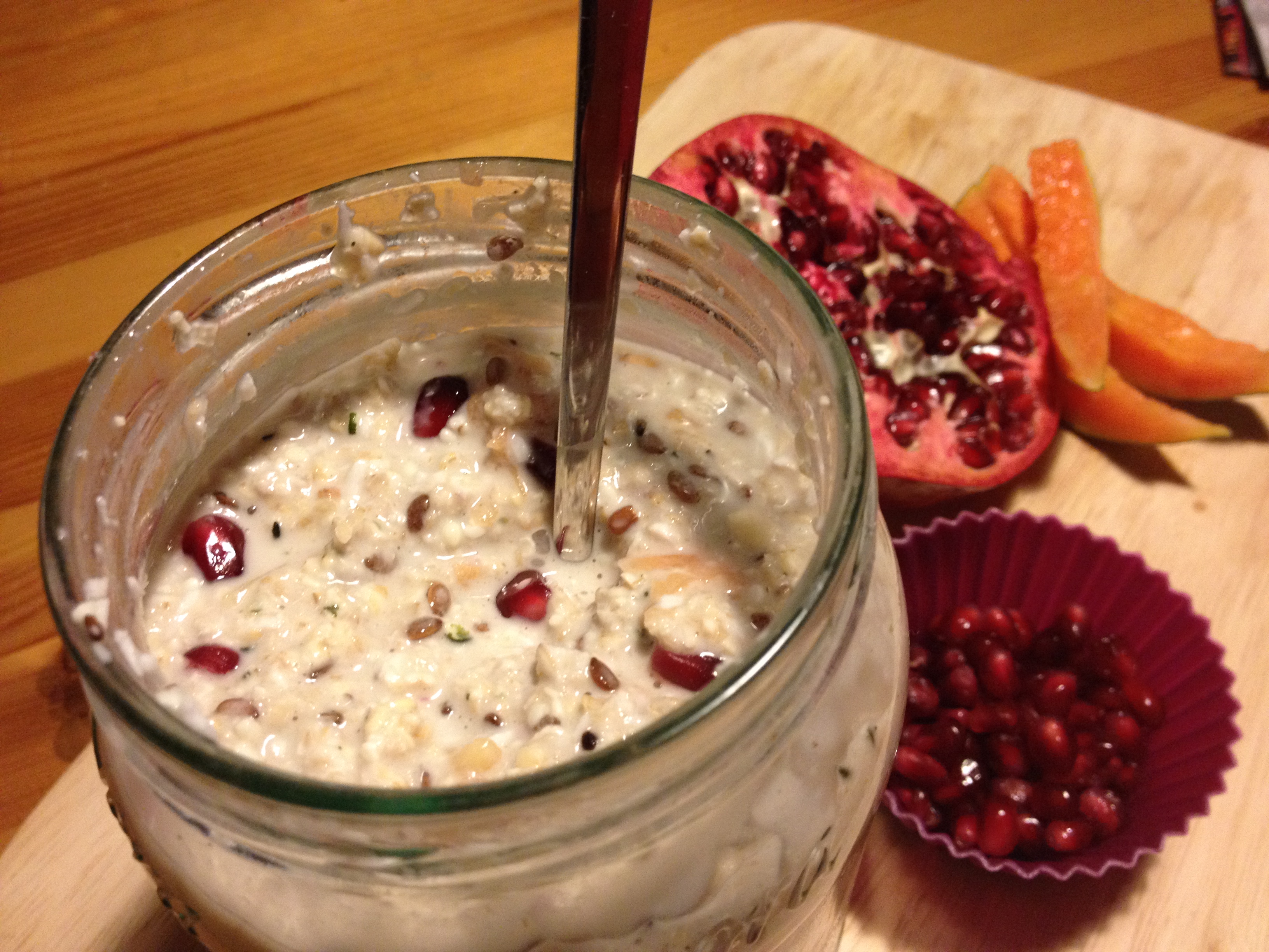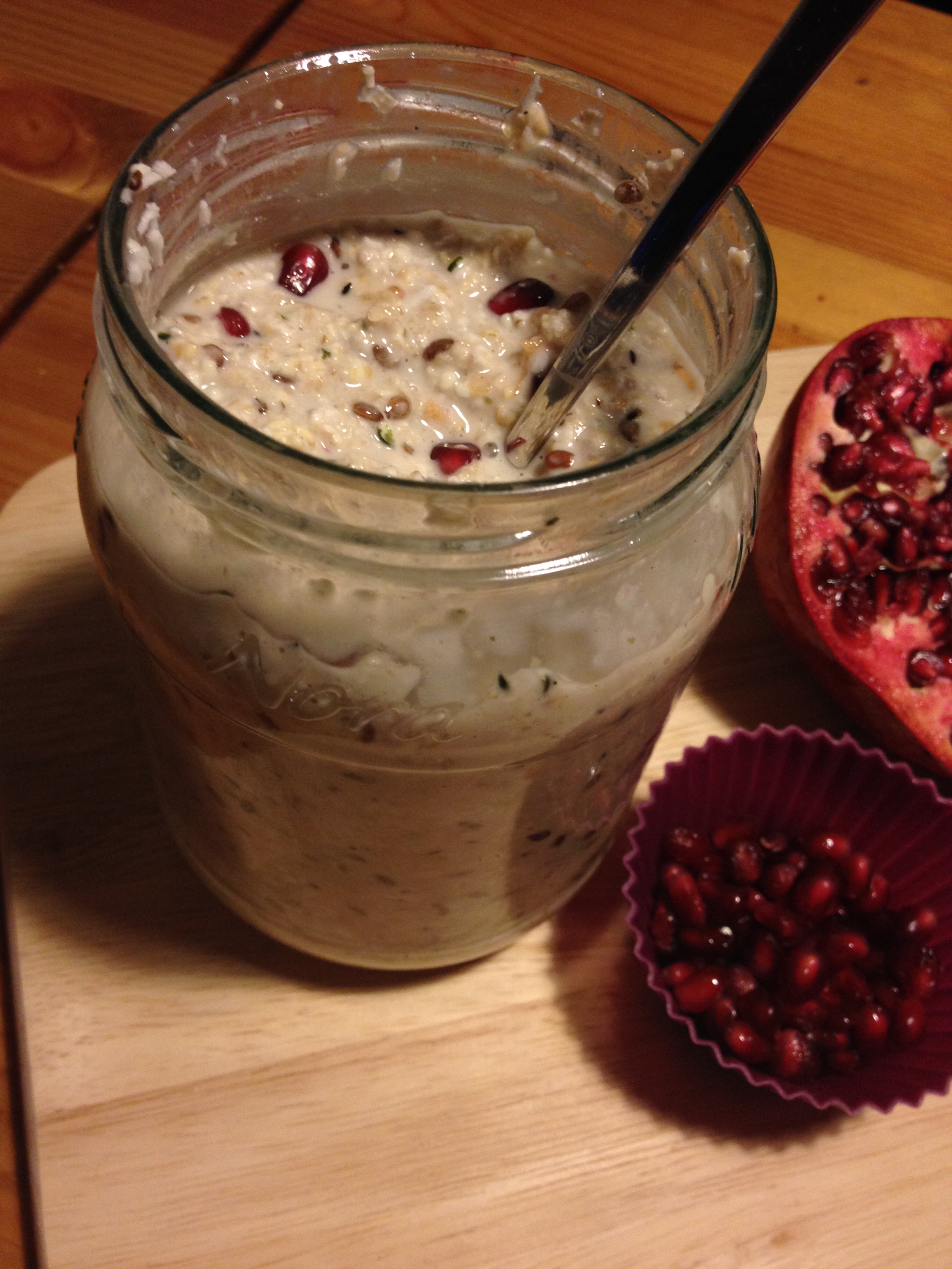 Öllu hrært saman, sett í stóra krukku og geymt í ísskápnum yfir nótt.