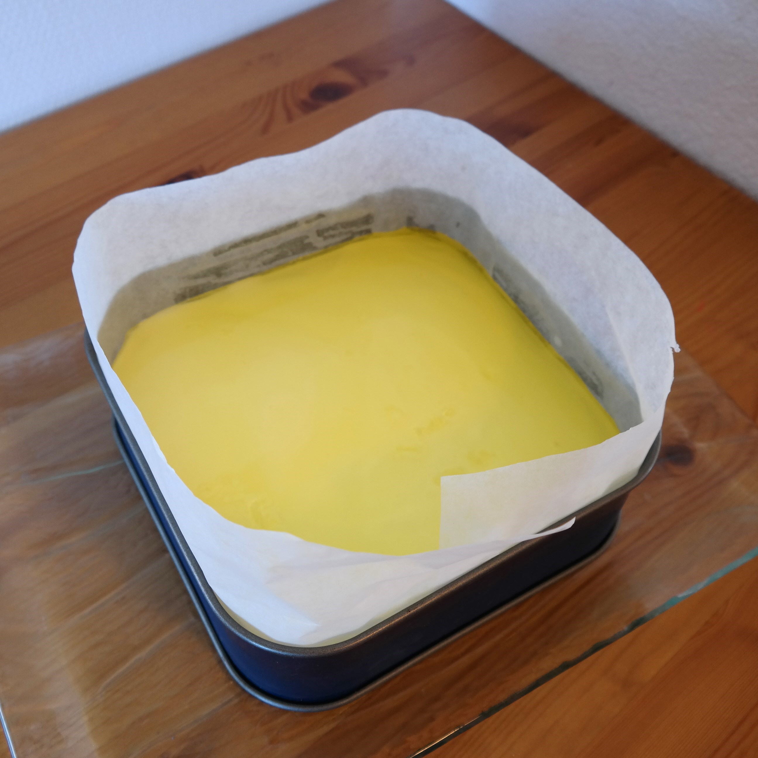 Fyllingunni er þá hellt í kökuformið á leyft að stífna í ísskáp í 4 – 6 tíma.