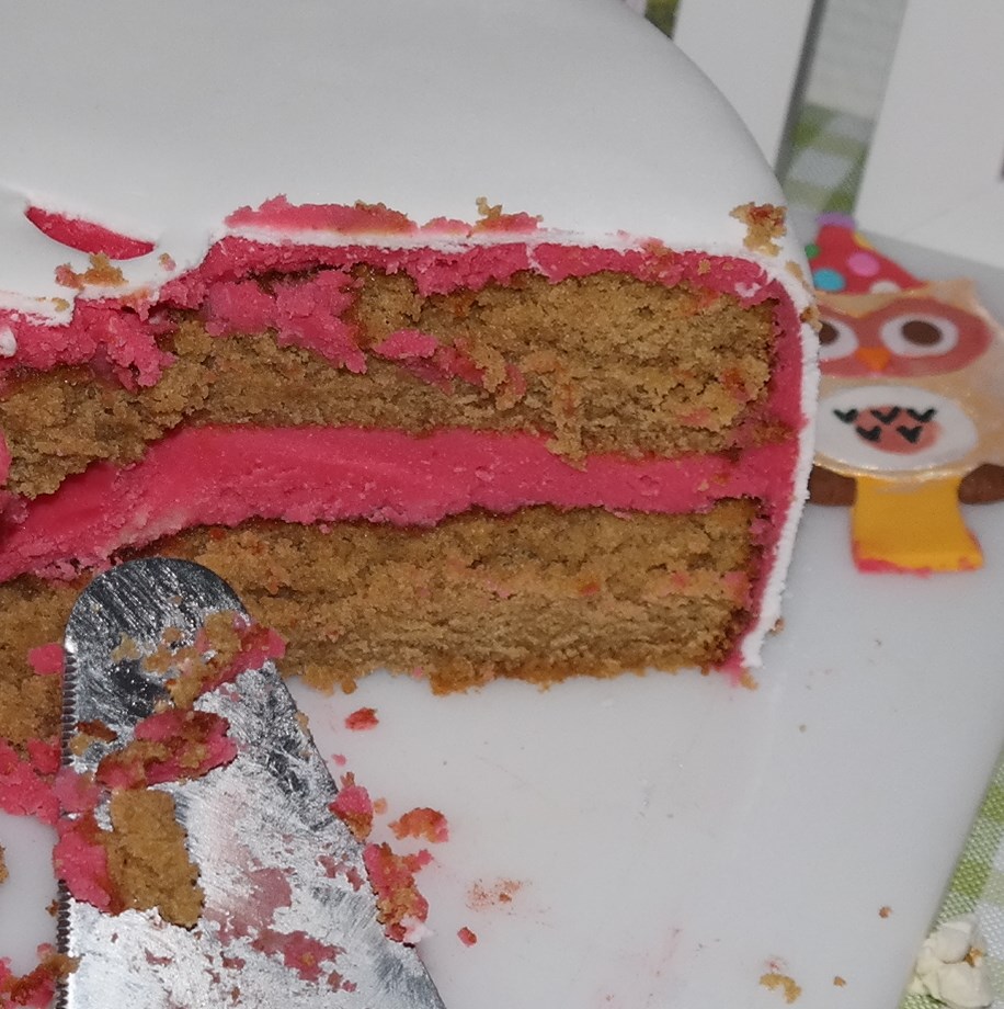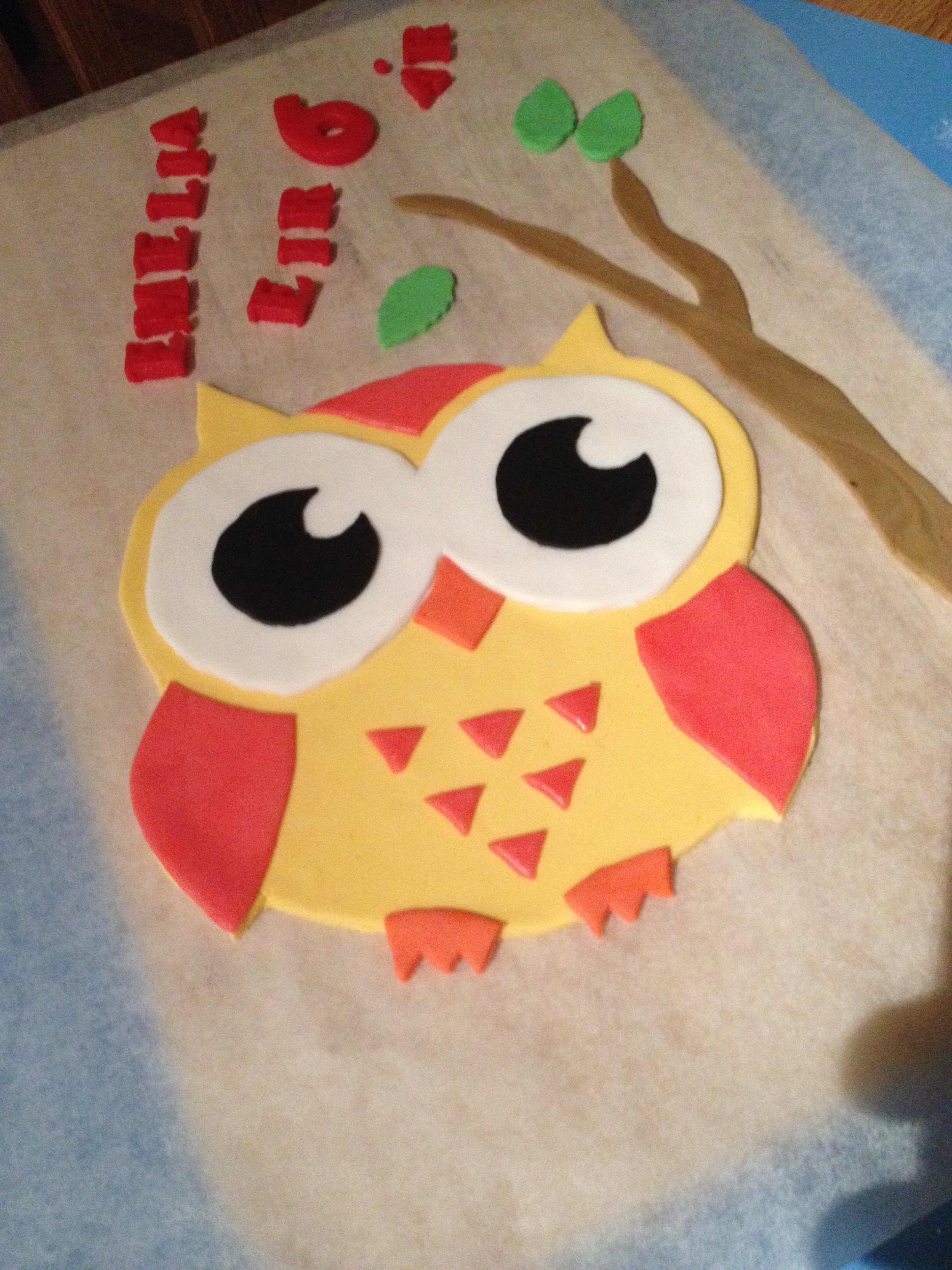 Notaði sömu köku uppskrift og að Uglukökunni hér fyrir ofan nema ég sleppti kakóinu og setti 3 msk vanillusykur í staðinn og hafði bleikt smjörkrem á milli botnanna. Kakan er dekkuð með sykurmassa og skrautið er úr bæði sykurmassa og gumpaste.