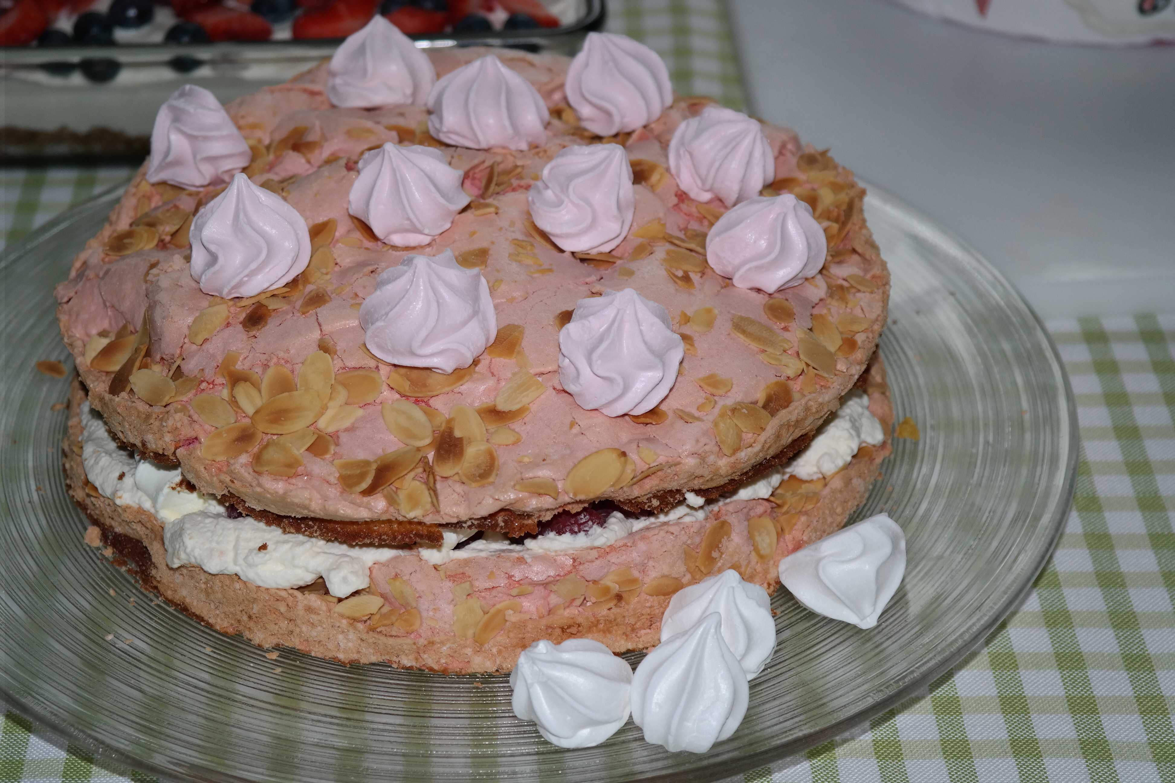 Frískandi og ljómandi góð terta sem sæmdi sér vel á veisluborðinu. Hefði getað notað aðeins meiri matarlit í marengsinn. Uppskriftina finnur þú hér.