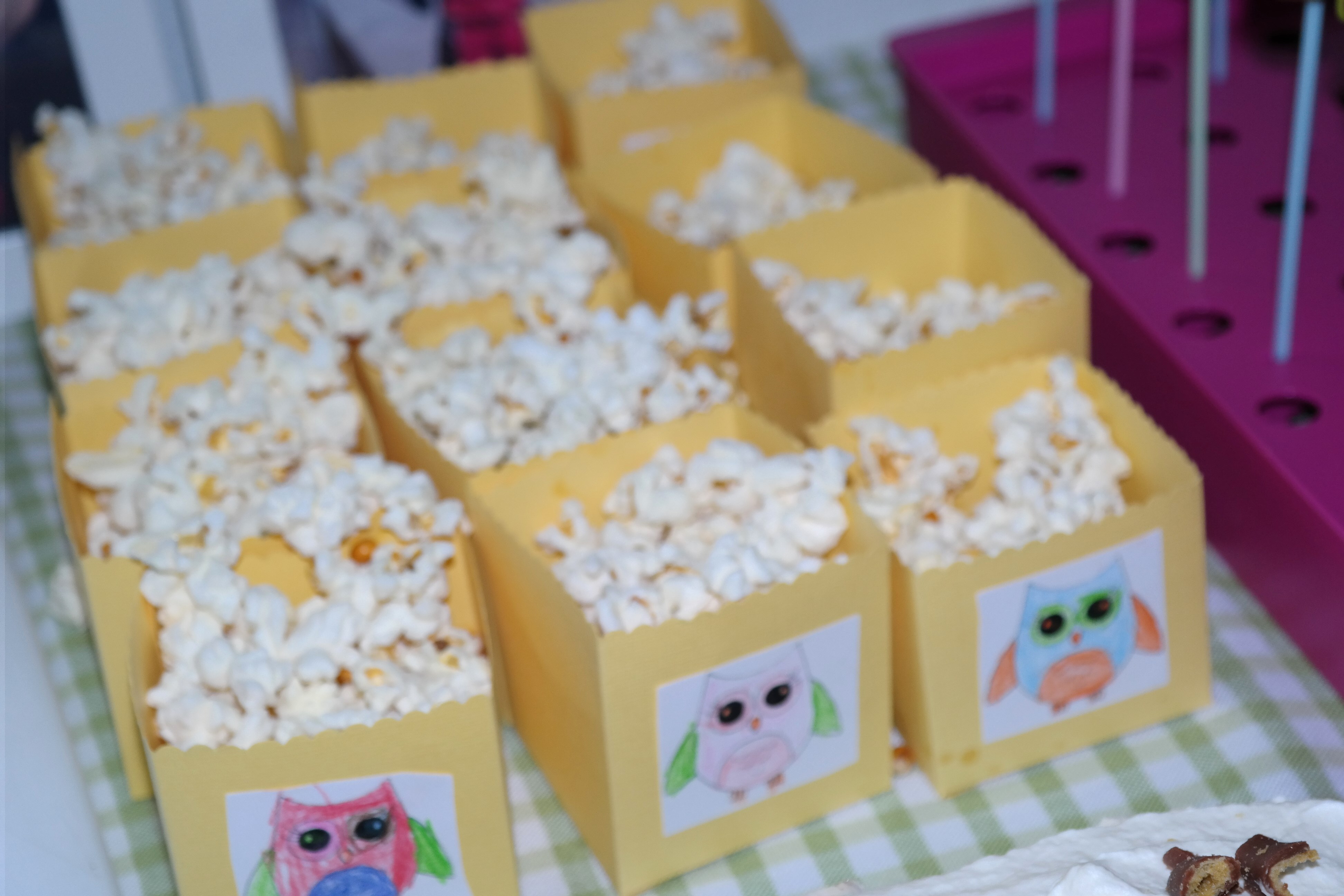 Við mæðgurnar föndruðum poppöskjur (leiðbeiningar) prentuðum svo út myndir af uglum sem afmælisbarnið litaði, klippti út og límdi á öskjurnar. Gaman að leyfa afmælisbarninu að taka þátt í afmælis undirbúnngum og þá sérstaklega þar sem henni þykir fátt skemmtilegra en að föndra.