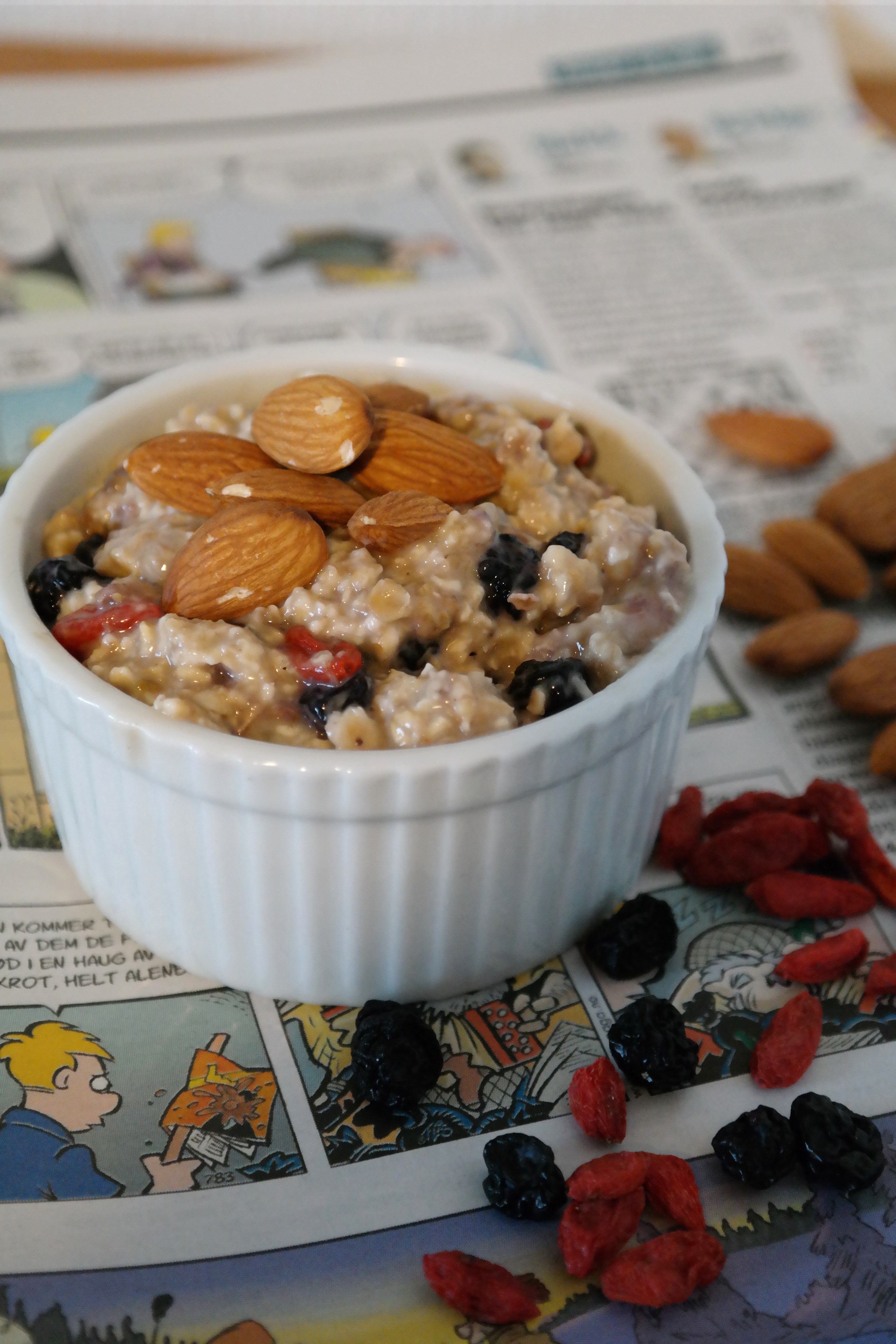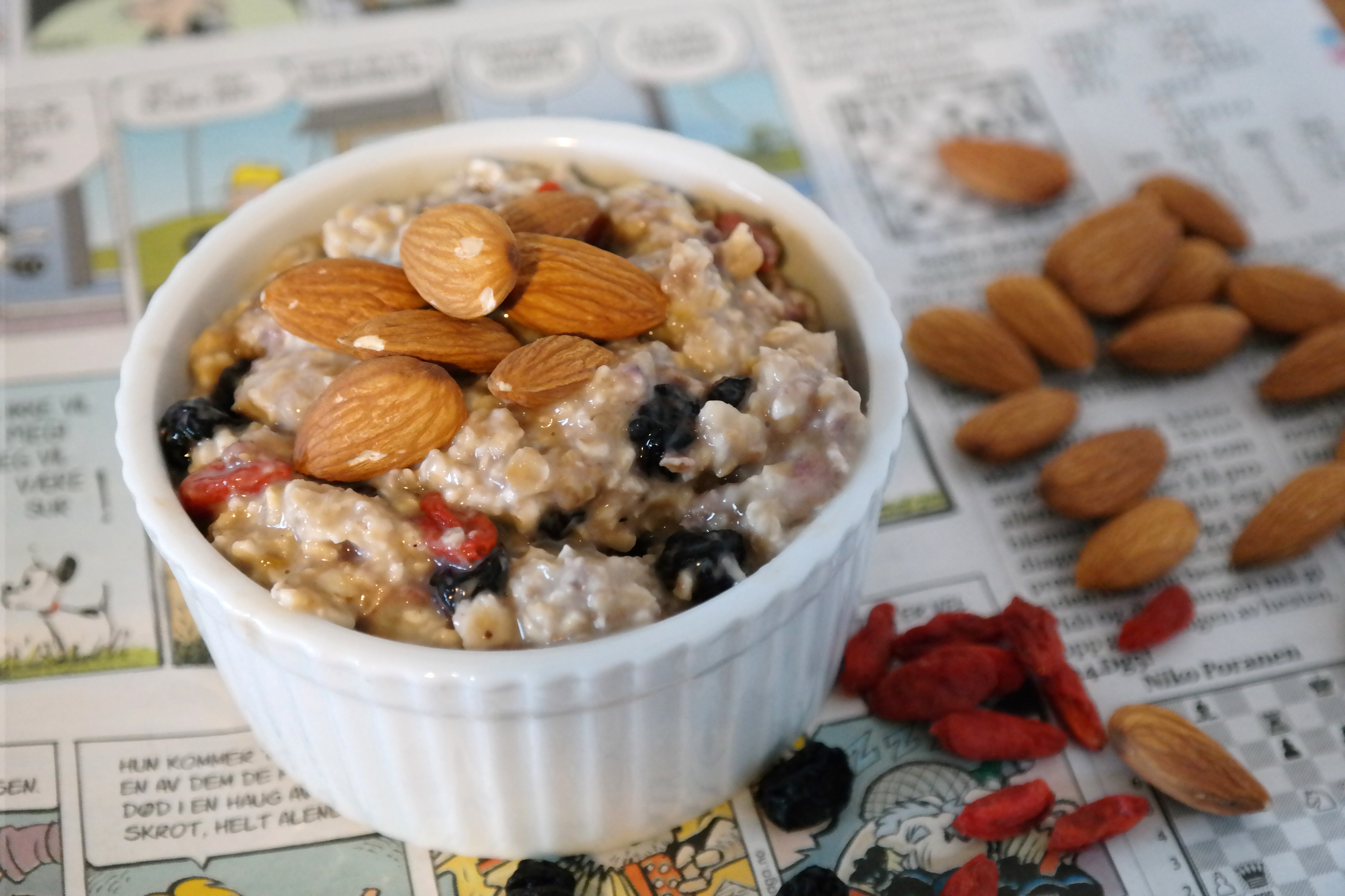 Blanda vel saman og geyma í lokuðum umbúðum í ísskáp yfir nótt. Berið fram með möndlum og ferskum berjum.