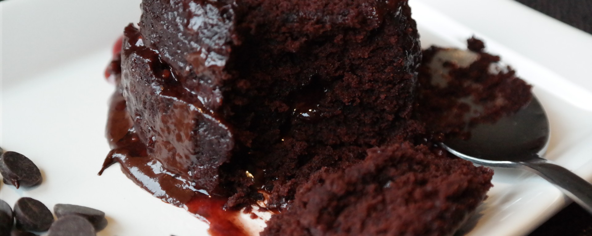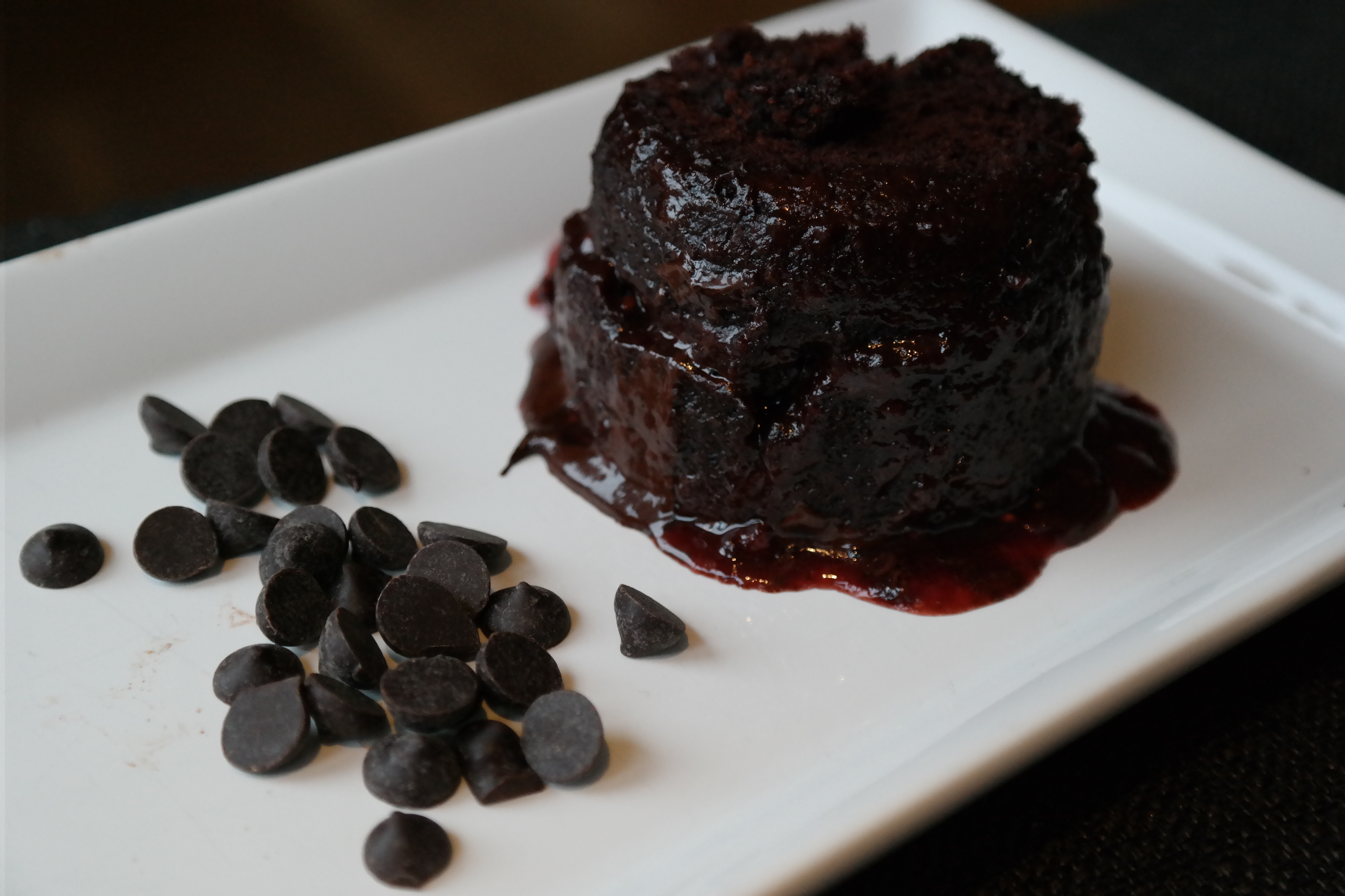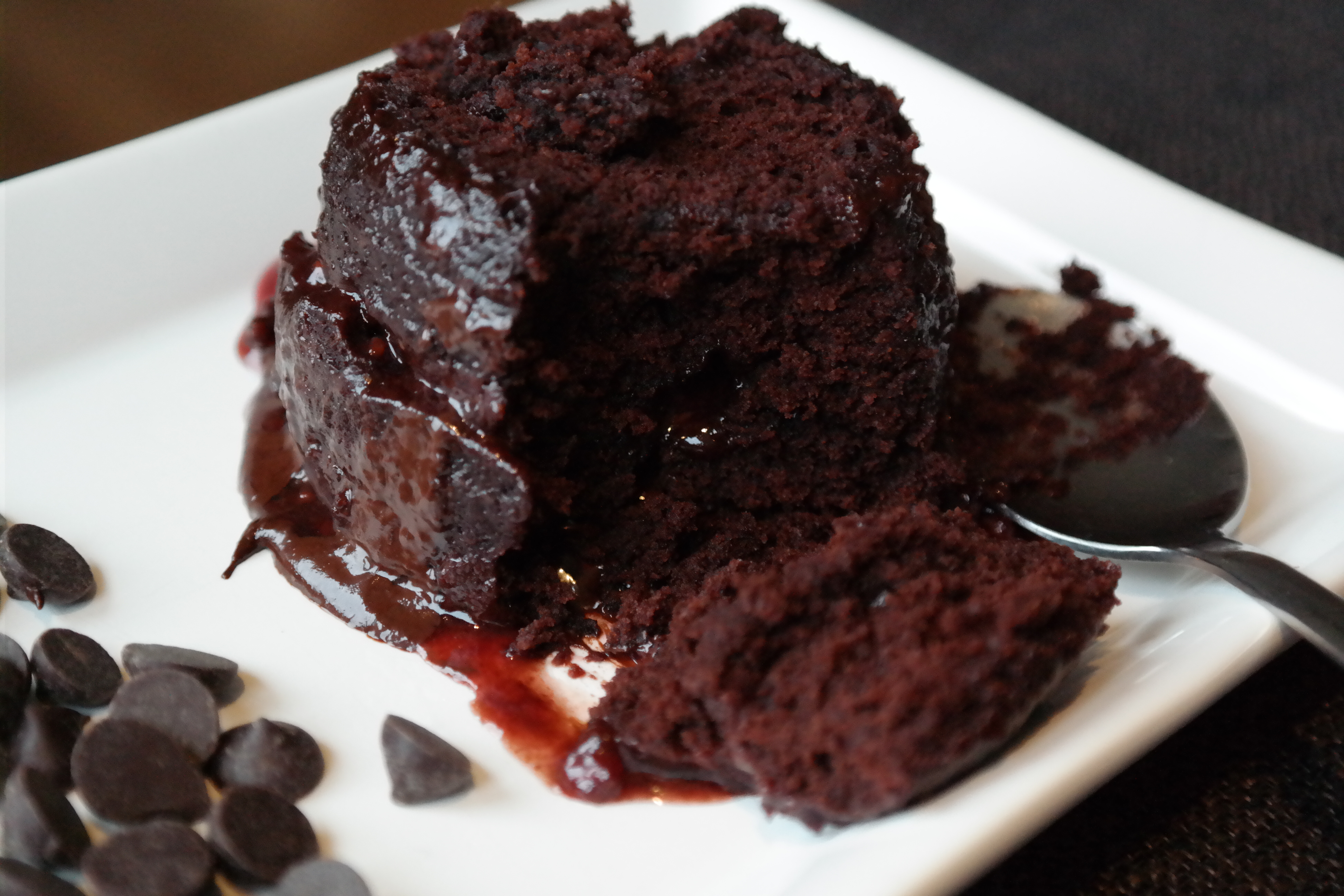 Ef þú ætlar að nota bökunarofninn skaltu forhita hann við 180°c, ég nota örbylgjuofninn. Best er að nota hitaþolna könnu eða annað bökunarform sem er sem líkast könnu eða bolla. Smyrja bökunarformið / könnuna. Í litla skál blanda saman fyrstu 6 innihaldsefnunum, því næst er olíunni, vanilunni og mjólkinni blandað saman við. Helmingur deigsins er settur í botn formsins/könnunar þá er hindberja stappan/sultan og ef til vill súkkulaði droparnir sett ofan á deigið og svo að lokum restin af deiginu. Bakað í 30-40 sekúndur í örbylgjuofni eða 13 – 14 mínútur í bökunarofni. Leyfa kökunni að kólna aðeins áður en reynt er að ná henni úr forminu/könnunni.