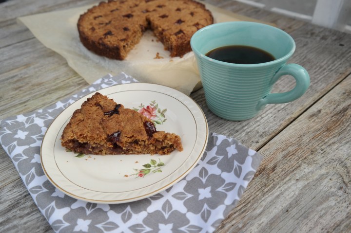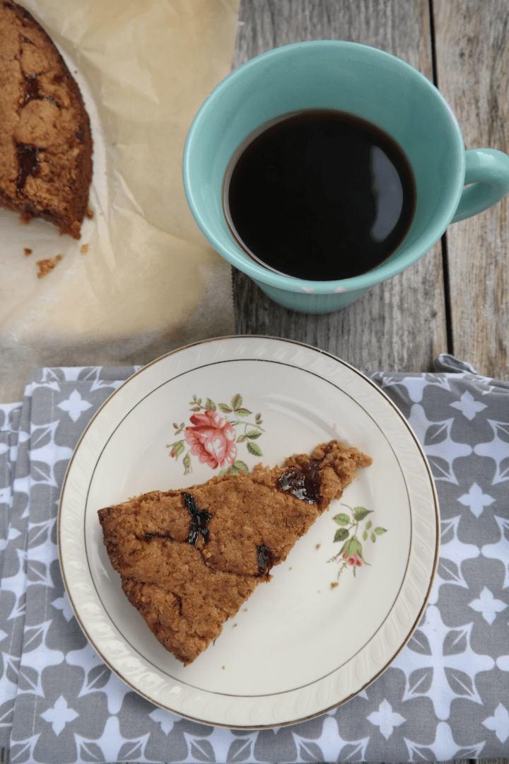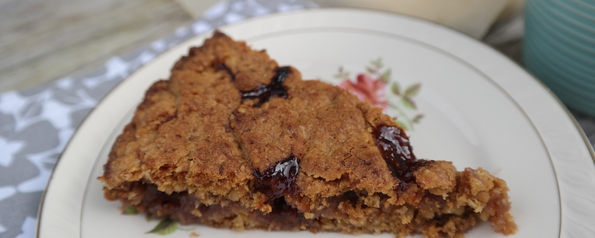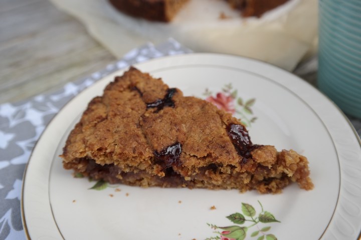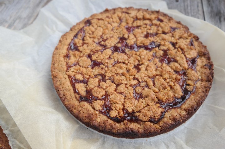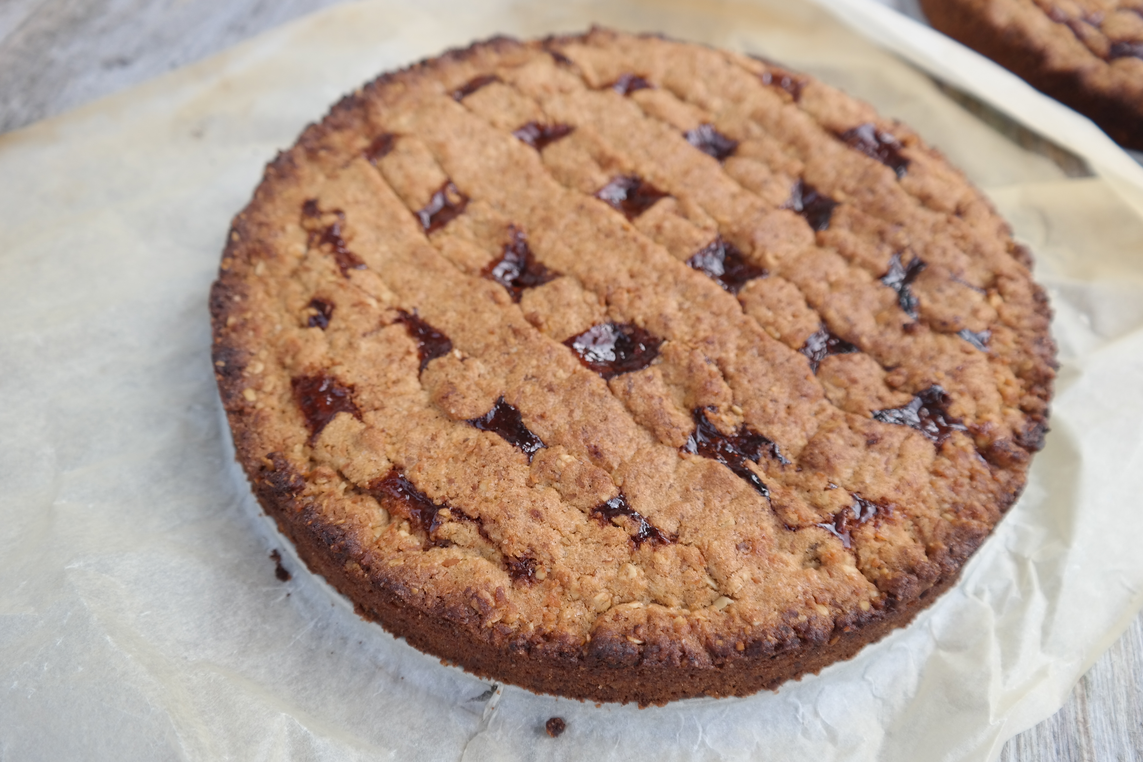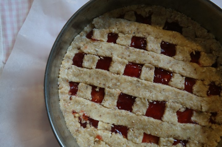 Deiginu skipt niður á tvö 24 cm bökunarpappírs klædd springform. Deiginu er þrýst í botnana (leggja smá deig til hliðar sem svo annaðhvort er stráð yfir kökurnar eða mótað munstur)