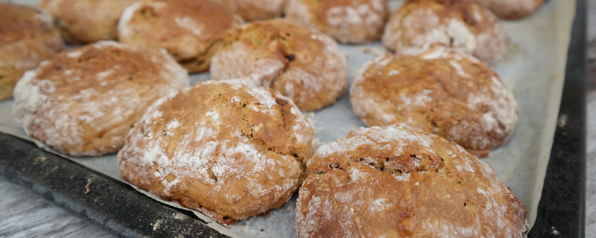Nota stóra skeið, skeiðin fyllt og deigið sett á hveitistráð borð. Rúlla út bollu úr deiginu, sem síðan er sett á bökunarpappírs klædda ofnskúffu og þrýsta vel ofan. Úr verða 20 skonsur.