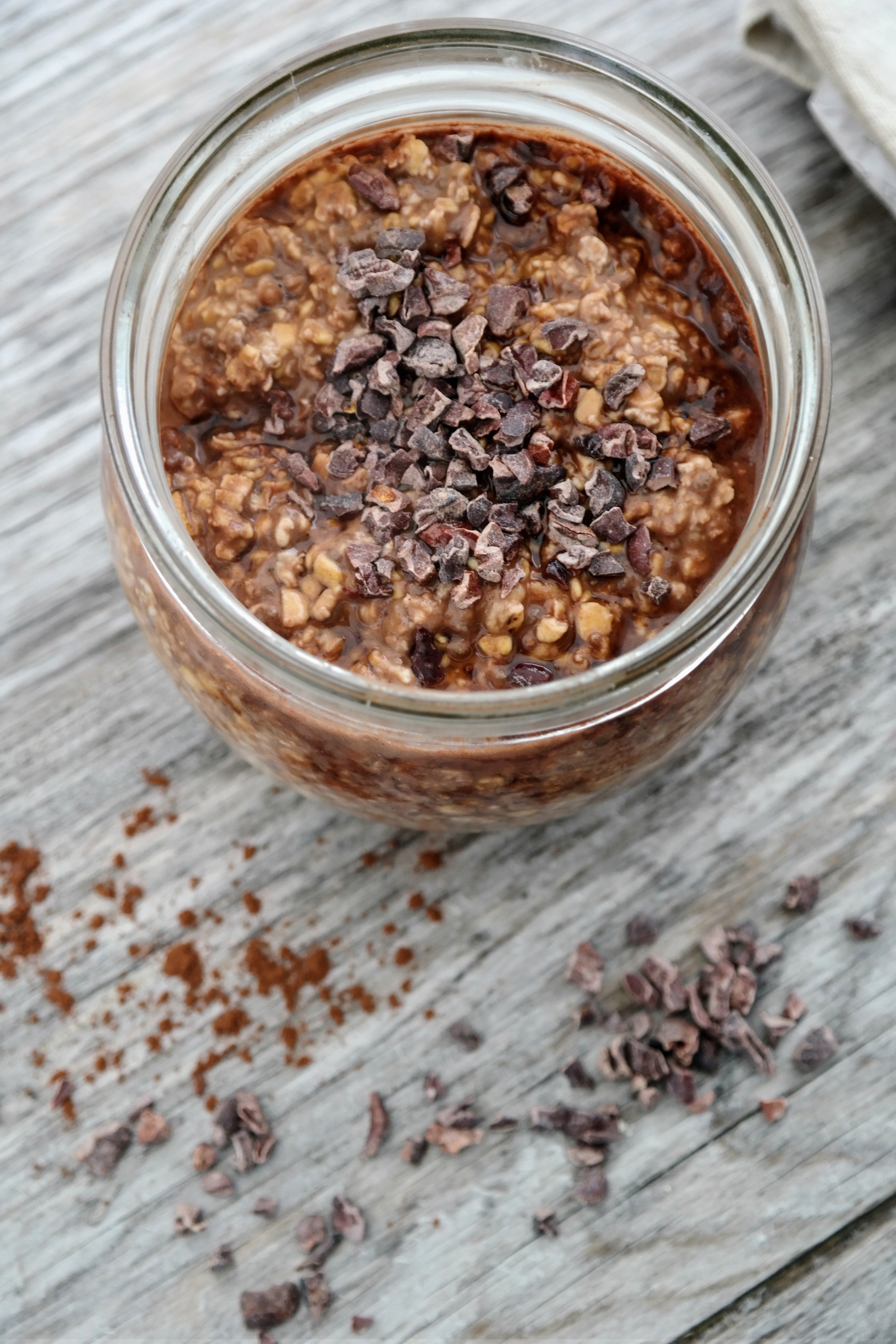 Allt (fyrir utan kakóanibburnar) sett í krukku og hrært vel saman. Sett í kæli yfir nótt.